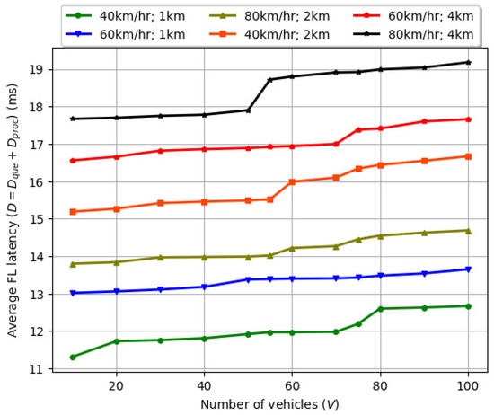 In this paper, to resemble a real-world situation, we assume that the transmission and propagation delay are an additional 10% of the total delay () by virtue of fifth-generation (5G) communication infrastructure. In existing approaches, Federated Averaging (FedAvg) functions as a collaborative learning algorithm where each participating vehicle performs local model training using stochastic gradient descent (SGD) by averaging the local model parameters [23]. Here, each vehicle’s contribution is proportional to its dataset size. Measuring the contribution of each vehicle based on local sensor data is statistically challenging [24]. Therefore, to effectively capture and analyze the delays caused by local model processing at each vehicle and the subsequent communication of model updates to the UAV, the iterations of the FL training procedure are modeled using Markov kernels [25].