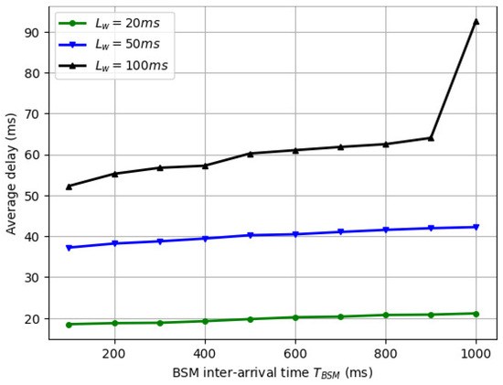 where p is the steady-state transmission probability of a packet from a vehicle to the UAV without queuing. Parameter m is the number of states in the system and the terms and are the steady-state probabilities of states and , respectively. The expected time spent by a packet in state until it is transmitted to the next state is a geometrically distributed random variable. The mean sojourn time of each packet in state is obtained from the state probability given by Equation (20):