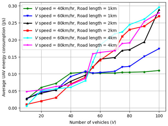Moreover, leveraging the collective perception messages (CPM) and basic safety messages (BSM) defined by the Society of Automotive Engineers (SAE), we analyze how a UAV’s average energy consumption, measured in Joules/second, varies with the vehicle velocity, road length (), and the number of vehicles (V) [18]. In addition, we assume an ideal and fair decision-making process by the UAV when determining a subset of the vehicles for communication and resource allocation in each TTI. Lastly, trajectory optimization and UAV localization and mapping to serve the maximum number of vehicles are critical to ensure optimal resource allocation and UAV power consumption. Here, we assume that the UAV follows an elliptical trajectory, ensuring that it consistently remains within the coverage zone of the vehicles and avoids drifting outside the communication range. The principal contributions of this manuscript are as follows: