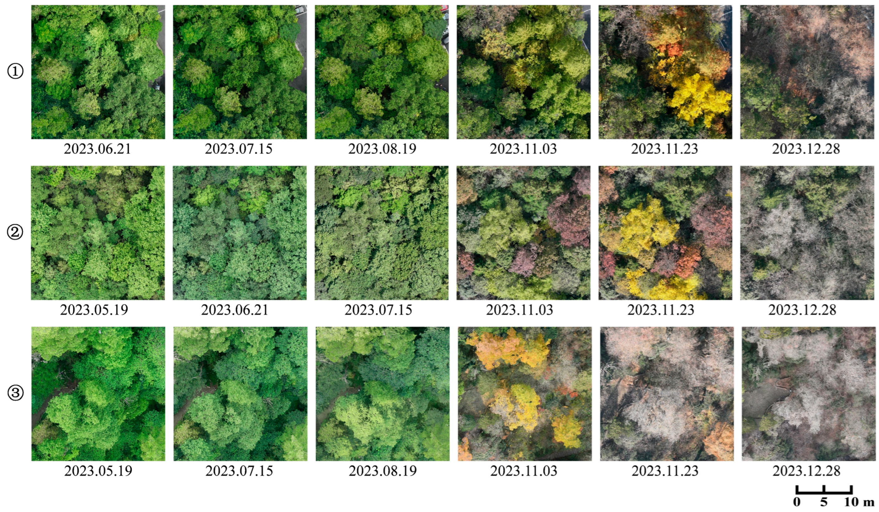Figure 2 presents excerpts from the orthoimages of plots, captured across different months. It is evident that during the leaf-off period, after the trees have shed their leaves, the feature differences among tree trunks are minimal, making species identification of Ginkgo challenging using these images. Therefore, to ensure identification accuracy, post-defoliation imagery was excluded from the study’s dataset.