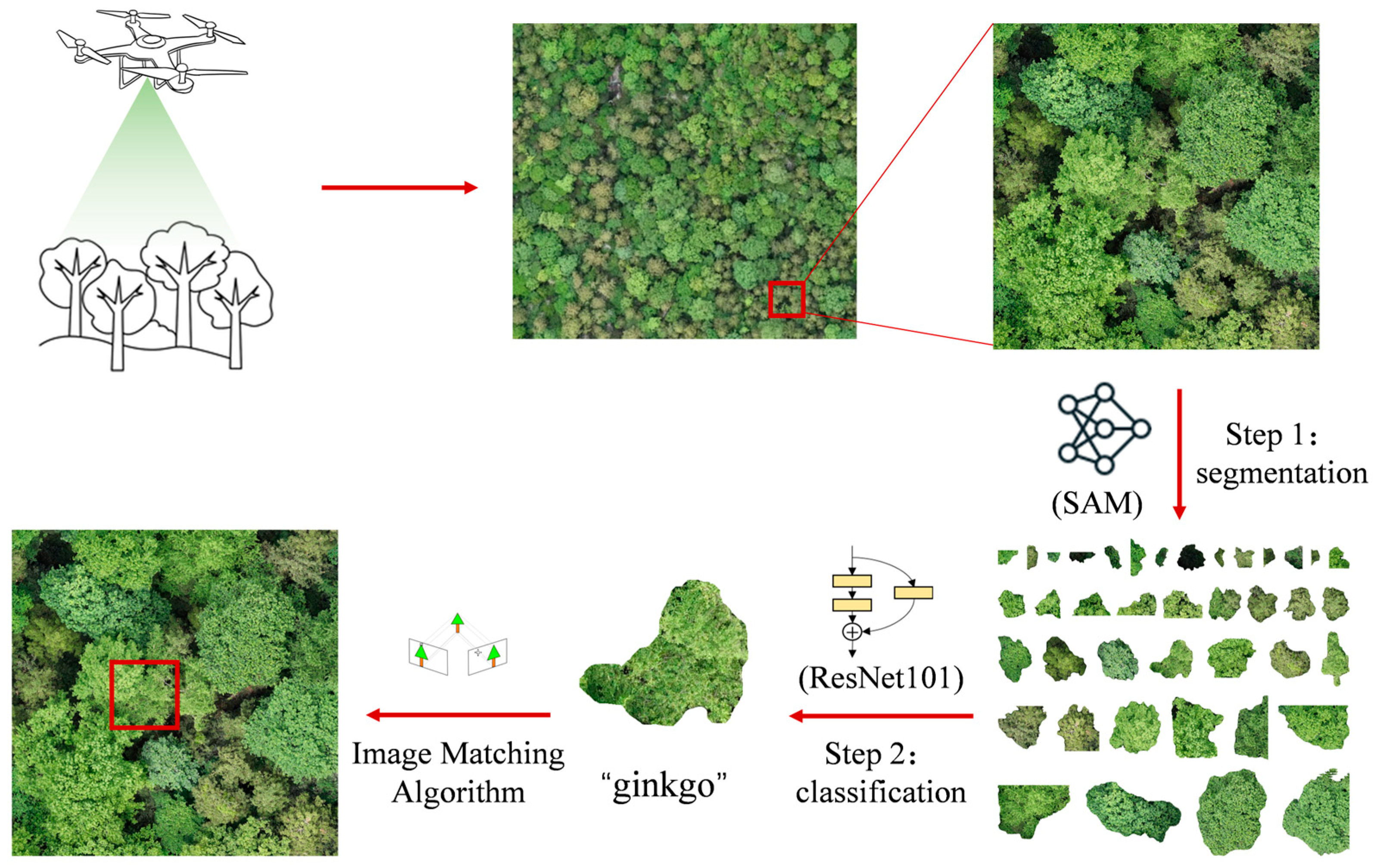 23].The main aim of this work is therefore to propose and evaluate a novel two-stage framework for accurate Ginkgo tree identification from UAV imagery. We leverage a fine-tuned SAM for precise canopy segmentation, followed by a ResNet-101-based model for robust classification. We test this approach on a challenging dataset collected from a mixed-forest environment across two key phenological periods and benchmark its performance against the YOLOv8 model. This framework provides a reliable and high-precision solution for Ginkgo identification, offering valuable technological support for biodiversity monitoring and refined forest resource management.