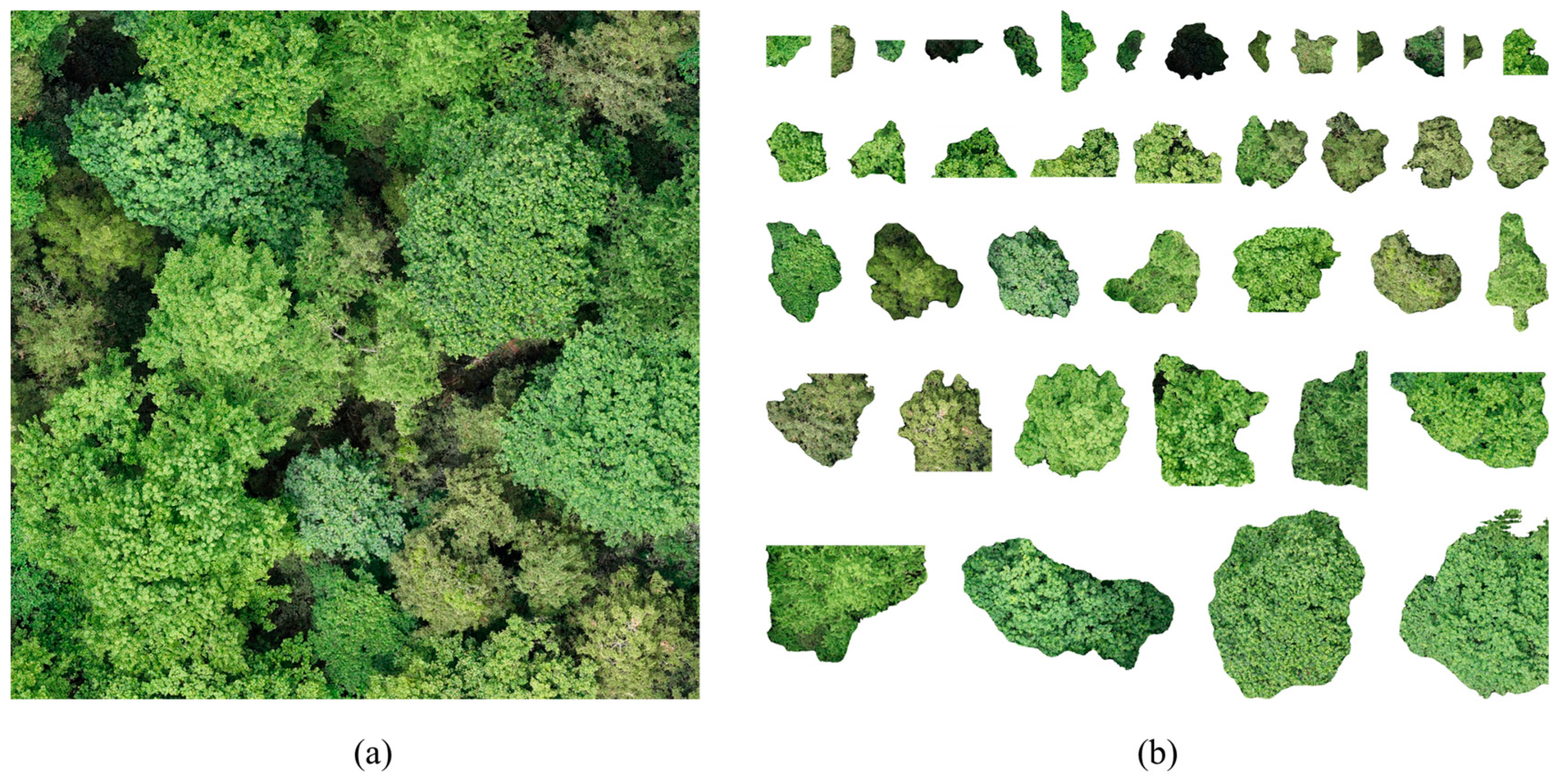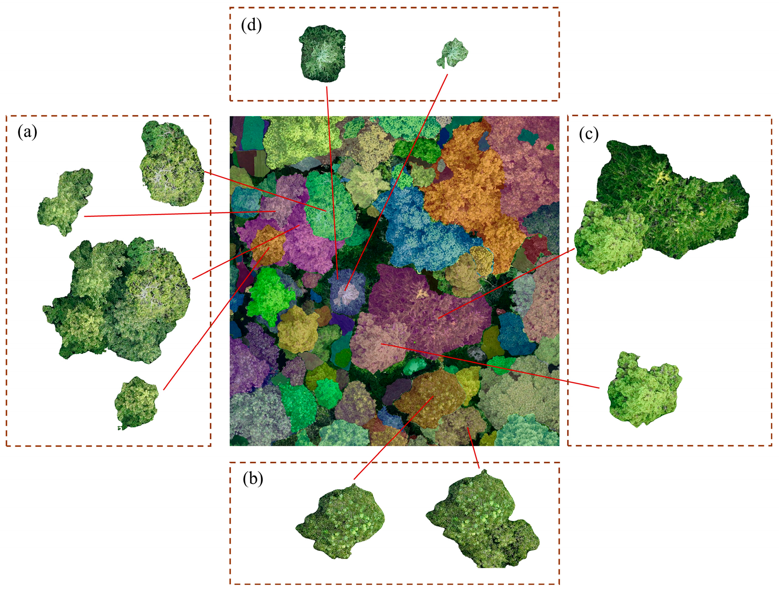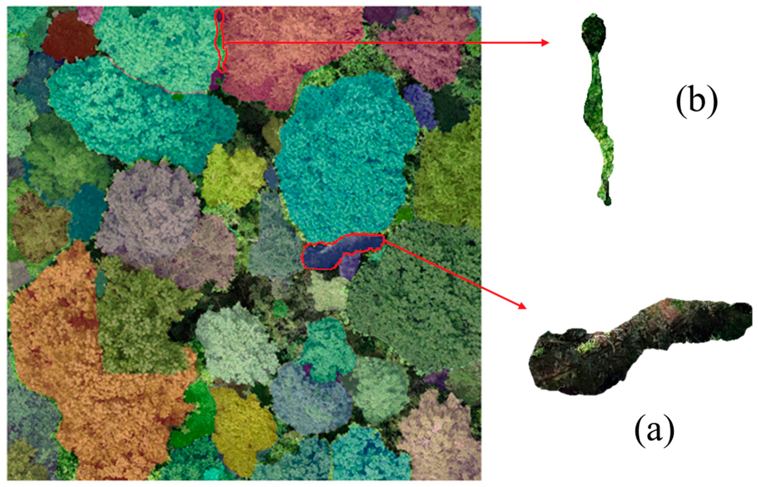 Figure 6a–c). Small spurious masks such as a shadowed area, a sunlit leaf cluster, or a patch with different texture or color may also appear, but these false masks are usually caused by local illumination differences or within-crown texture variation and do not represent distinct tree crowns (
