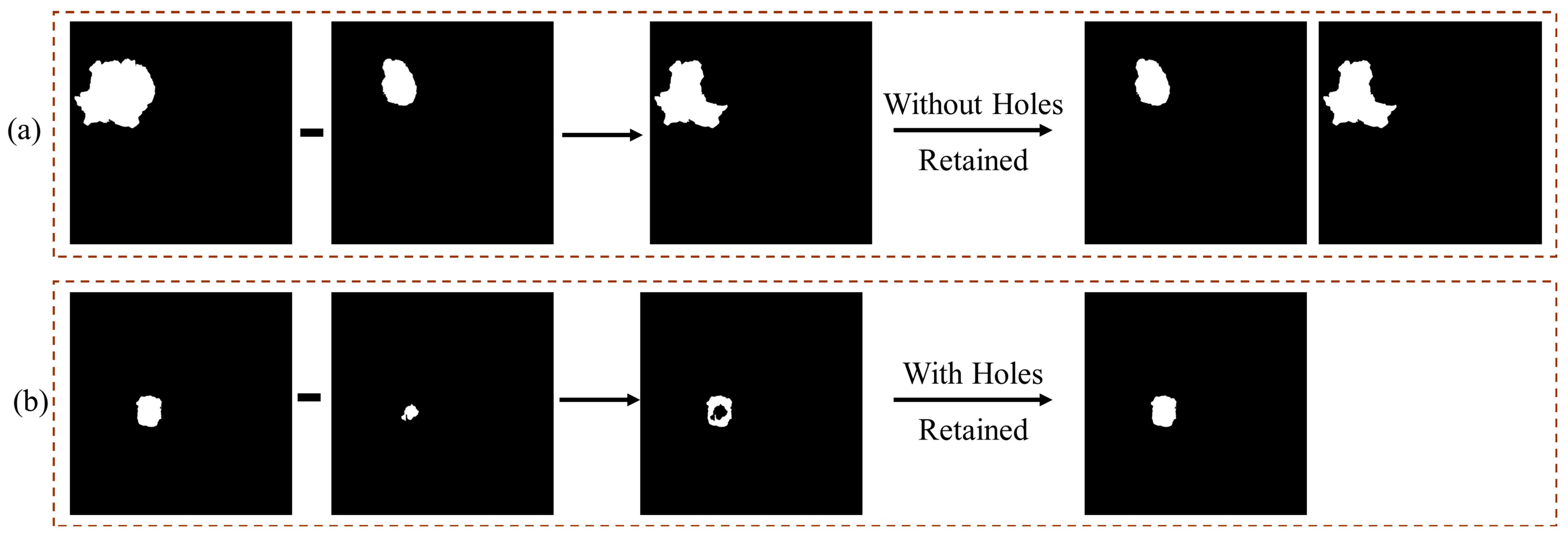 Figure 7a). In the other case, if the residual mask contains an internal hole, this corresponds to the second scenario, a spurious mask within a larger canopy. Here, the smaller mask is considered an artifact and is discarded, while only the original, larger mask is kept (