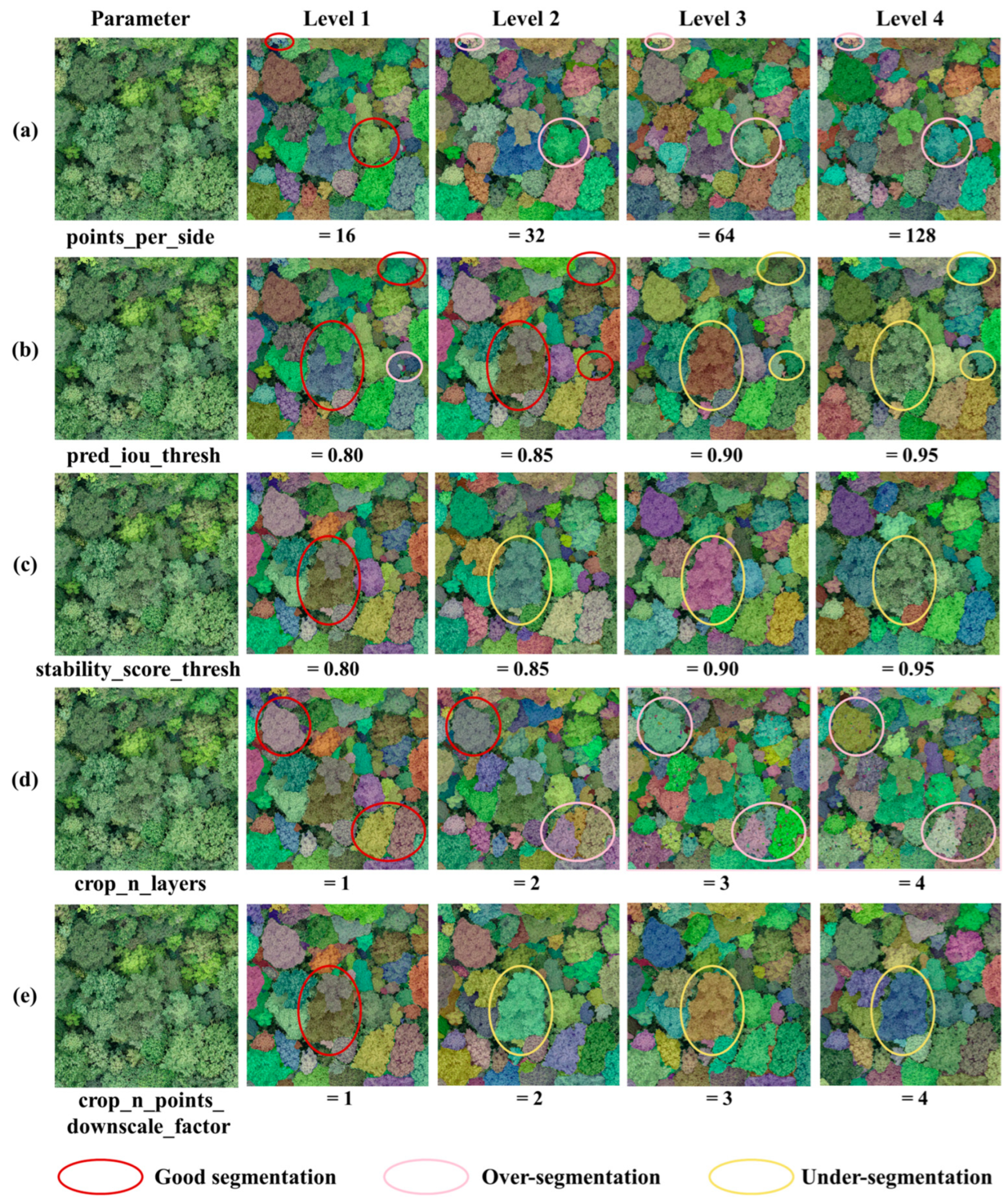 Points_per_side, which determines the number of sampling points along each side of the image and therefore controls the granularity of mask generation. A higher value increases boundary precision but also raises computational cost. Pred_iou_thresh and stability_score_thresh, two mask quality filters that, respectively, govern confidence and robustness. The first ensures that only high-confidence masks are retained, while the second discards unstable predictions, reducing over-segmentation and false boundaries. Crop_n_layers, which defines the number of pyramid levels used for multi-scale analysis, allowing the model to detect both small and large crowns effectively. Finally, crop_n_points_downscale_factor, which adjusts the density of sampling points during cropping to balance efficiency and local detail preservation.
