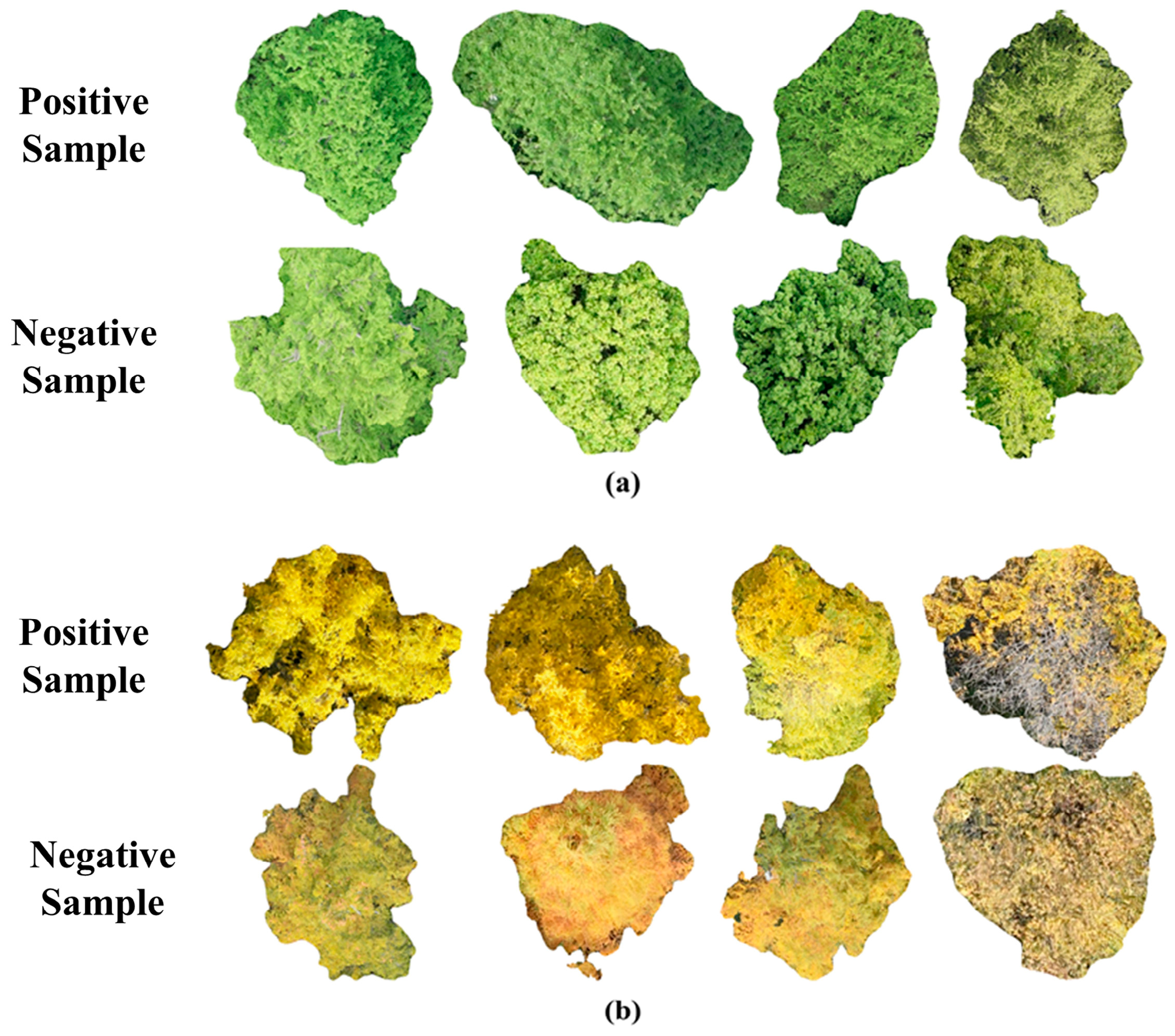 https://ginkgo.zju.edu.cn/), and overlaid with the generated orthomosaics. This direct spatial matching allowed precise localization of each Ginkgo individual within the imagery. Subsequently, leaf-color changes within these verified tree crowns were visually examined to confirm their phenological stage. This combined approach ensured that the classification accurately represented the true phenological state of the target Ginkgo trees and minimized potential misidentification caused by co-occurring species.