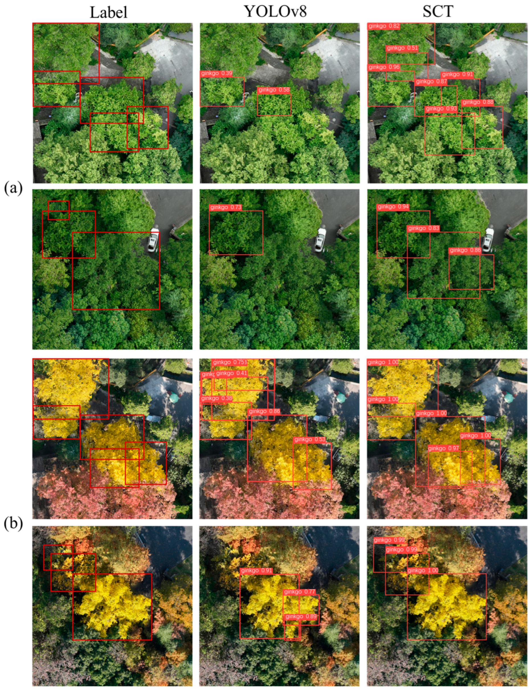 Our findings strongly reaffirm the importance of phenology in tree species identification. The performance gap between the yellow-leaf and green-leaf stages was significant for both the STC strategy and YOLOv8. The distinct golden-yellow foliage of Ginkgo in autumn provides a powerful spectral signature that simplifies the classification task, leading to an outstanding F1-score of 92.96% with STC.