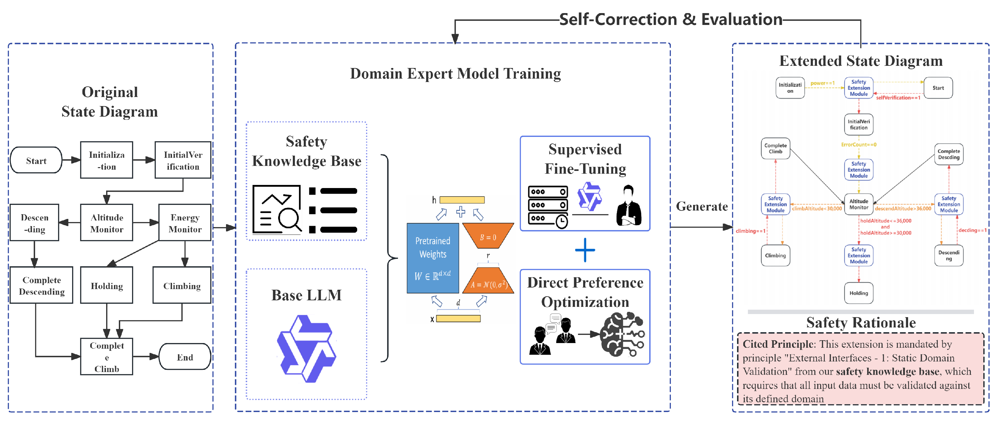 In Phase 2: Dynamic Safety Extension Reasoning, we use the trained Domain Expert Model as the core “execution engine” to perform specific safety extension tasks within a structured graph that possesses dynamic self-correction and intelligent exploration capabilities. This phase takes an Initial SysML State Machine Diagram as input. Our execution engine begins its work, with a core internal workflow that loops through generating an extension plan and safety rationale, followed by self-correction and evaluation based on the knowledge base. This loop iterates through Dynamic Exploration & Optimization until an optimal solution is found. Finally, this phase outputs two key products: an extended safety state machine diagram with endogenous safety semantics, and a corresponding Traceable Safety Rationale.