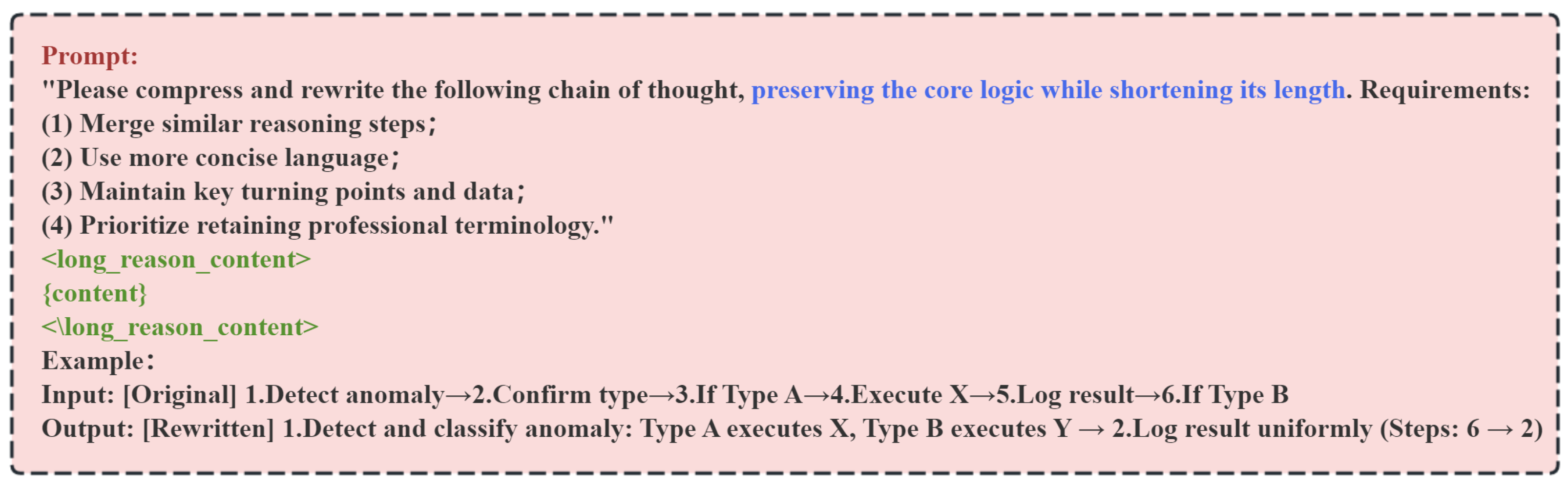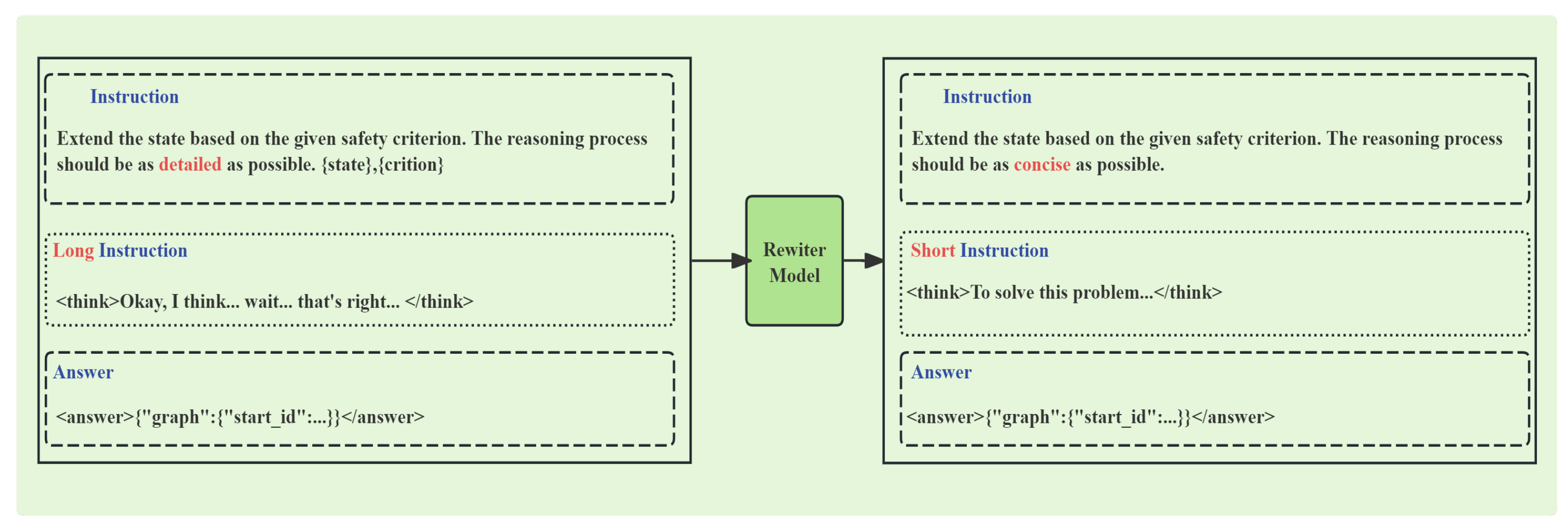 Figure 3 illustrates this rewriting process, where a rewriter model is prompted to compress a detailed, lengthy chain of thought (“Long Instruction”) into a concise version (“Short Instruction”) that retains the core logic.