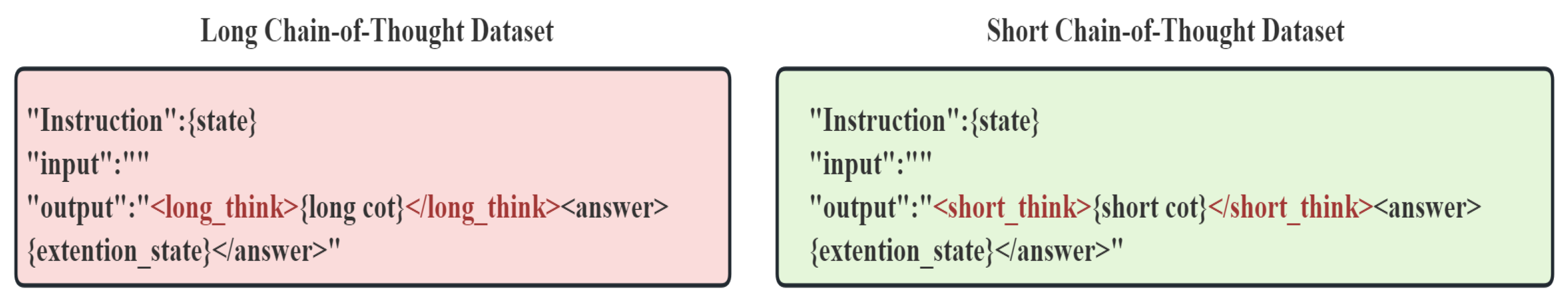 Figure 4 provides an example of the final data structure, contrasting the “long think” tag in the long-CoT dataset (left) with the “short think” tag in the short-CoT dataset (right).