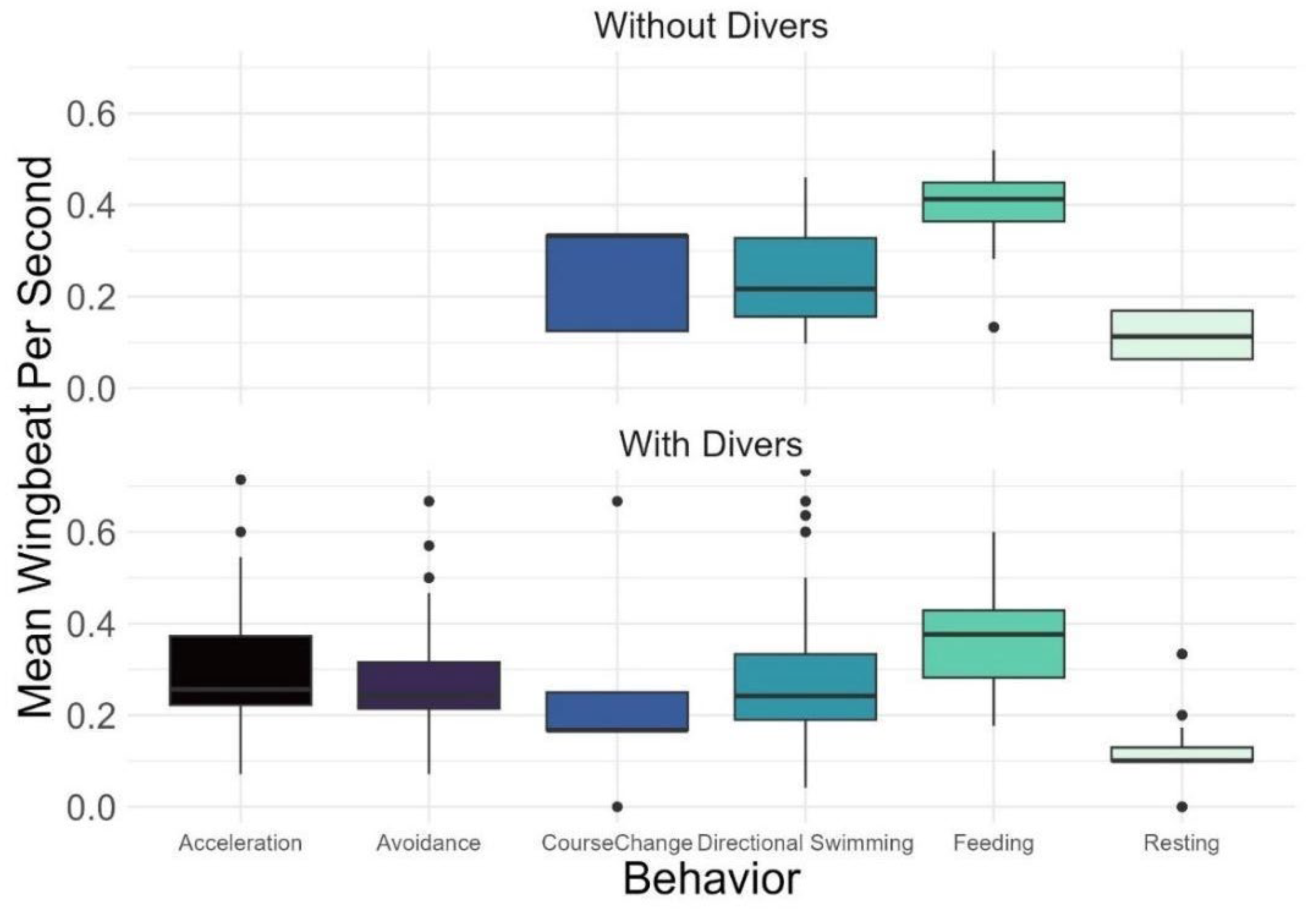 | 1. Acceleration | Avoidance | The focal manta ray suddenly increases its speed. Speed increase is accompanied by noticeably wider and quicker wingbeats. Or the manta ray performs a single wing beat, leaving its fins curved upwards in an “Omega-like” shape (ω) |