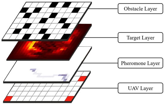 and consists of four overlapping functional layers: the Obstacle layer, Target layer, Pheromone layer, and UAV layer.