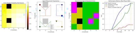 On the 5 × 5 map, four UAVs efficiently cover high-probability regions while avoiding obstacles. The highest-probability central target is prioritized, with only minor path adjustments due to edge obstacles. Through task auction and A* planning, UAVs evenly divide the area, keeping repeat visits below 20%. Phase 1 (95% coverage) completes in just 14 steps, reflecting effective collaboration.