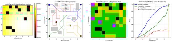 As shown in Figure 4, in the 10 × 10 medium map, despite a wider probability spread and denser obstacles, the system maintains stable performance. Task auction enables reasonable local division of labor and effective path detouring. The repeat visit rate remains below 25%, and Phase 1 is completed in 47 steps, confirming the algorithm’s robustness in moderately complex scenarios.