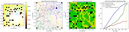 Operationally, we adopt a two-phase execution: Phase 1 ends once probability coverage reaches 95%, after which Phase 2 emphasizes full spatial coverage with stronger anti-revisit behavior; throughout, we record steps, Phase-1 completion time, final coverages, and overlap rate for evaluation.