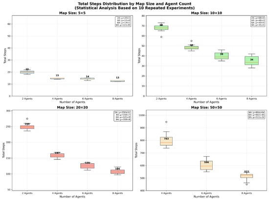 From the statistical results of 10 repeated experiments (see Figure 7), it is evident that the system demonstrates outstanding scalability and collaborative efficiency across different grid map scales and multi-UAV configurations.