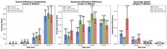 To verify the effectiveness and superiority of the proposed auction–pheromone hybrid algorithm, this study further conducts comparative experiments based on its efficiency and scalability evaluation under various configurations. Three SAR strategies are tested: a hybrid strategy (auction + pheromone), an auction-only strategy, and a pheromone-only strategy. Using a controlled variable approach, the experiments aim to quantify the contribution of each core component to overall performance and validate the technical advantages and practical value of the hybrid mechanism in cooperative search tasks.