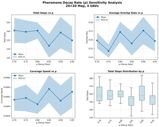 To evaluate the robustness of the proposed method, we conducted sensitivity analysis on the pheromone decay coefficient . We tested values ranging from 0.7 to 0.95 with 0.05 intervals on the 20 × 20 map with four UAVs (see Figure 10).