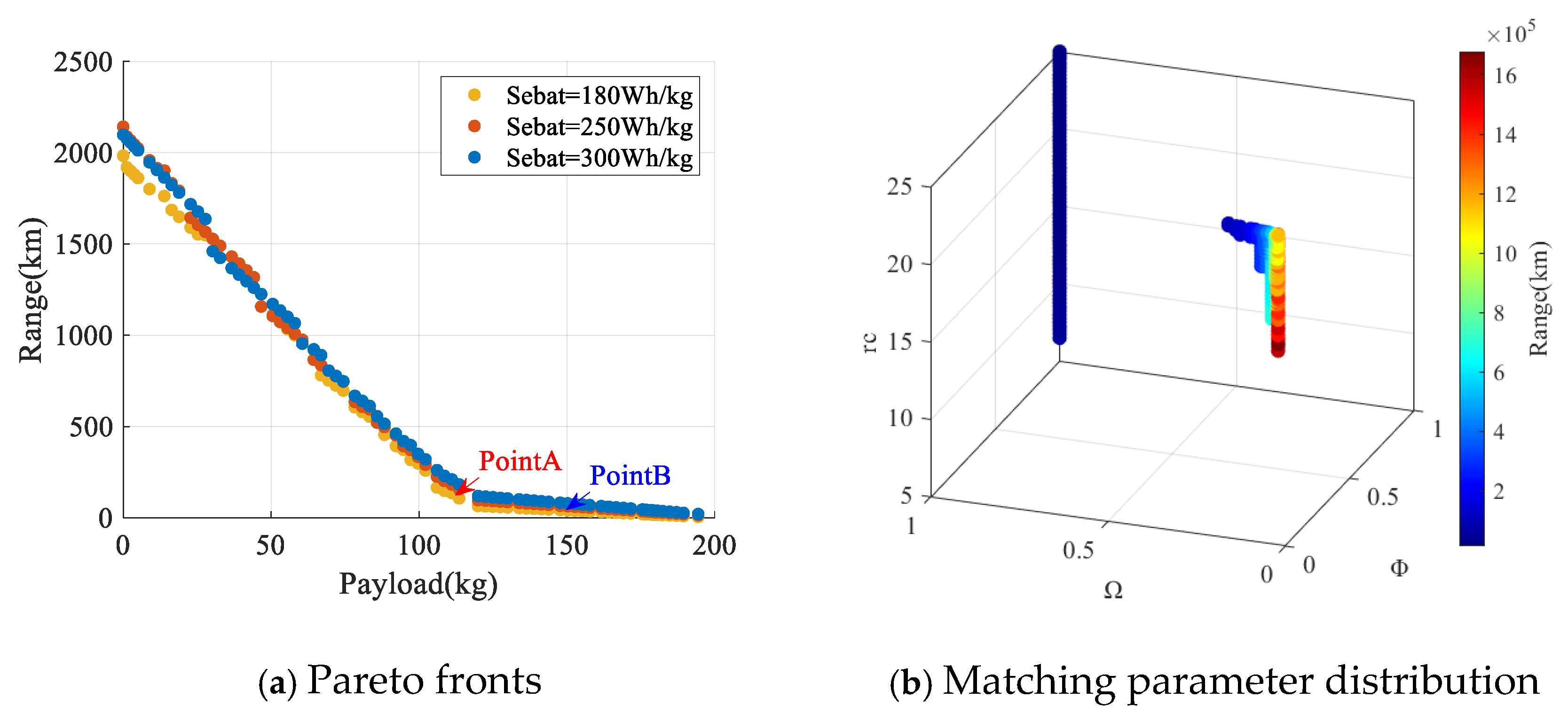 Based on the preceding series of formula derivations, the relationship between range and weight can be ascertained. However, directly exploring the design space using component-level inputs becomes computationally expensive and inefficient. To achieve global optimization, the hybrid power system model necessitates a balance between computational cost and precision, ensuring comprehensive design space coverage within finite computational resources. This challenge can be addressed through systematic coupling analysis between component parameters and range equations to identify key design freedoms, extract the independent, physically meaningful matching parameters, which can serve as effective control variables for design space exploration while maintaining physical interpretability.