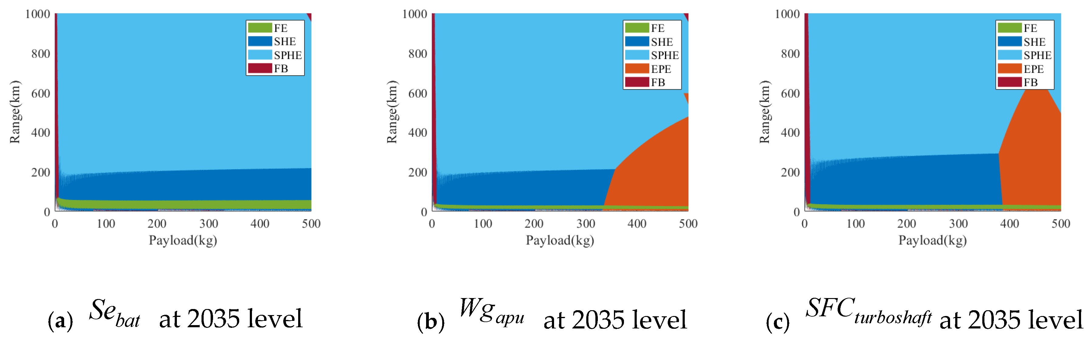 (1) The minimum MTOM configuration distributions derived for a 1000 km range and 500 kg payload indicate distinct applicability zones. The SPHE configurations are well-suited for medium–long-range missions (200–1000 km), while the SHE and EPE configurations dominate short-range operations (0–200 km). FE configurations are optimal for ultra-short-range scenarios (0–40 km). To enable the electrification of long-range, heavy-duty missions, coordinated advancements in both battery and combustion technologies are essential, supporting a dual-path optimization strategy.