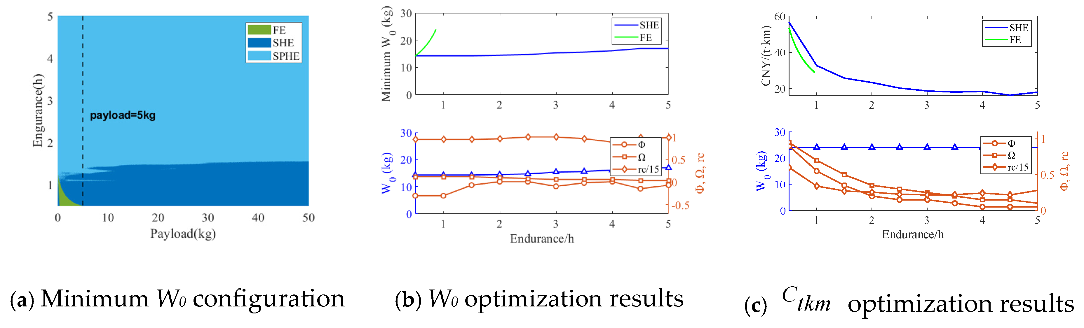 The analysis focuses on the SHE configuration. In Equation (14), the initial-to-final weight ratio enables estimation of the empty weight fraction using statistical data, while the payload, power system, and residual fuel fractions are derived analytically. According to the power–energy matching process shown in