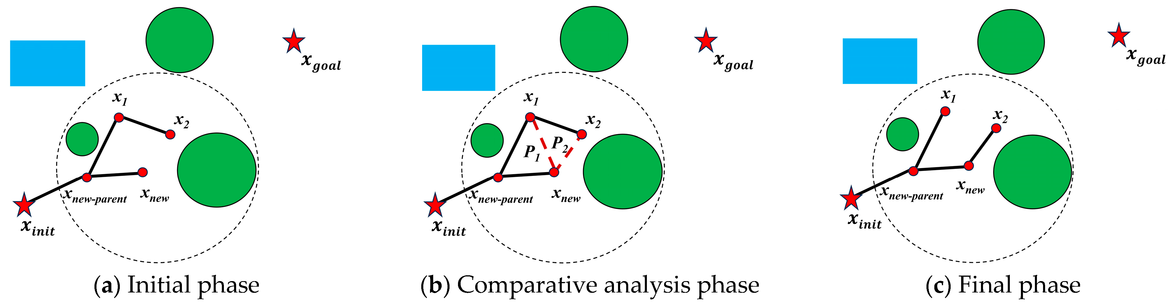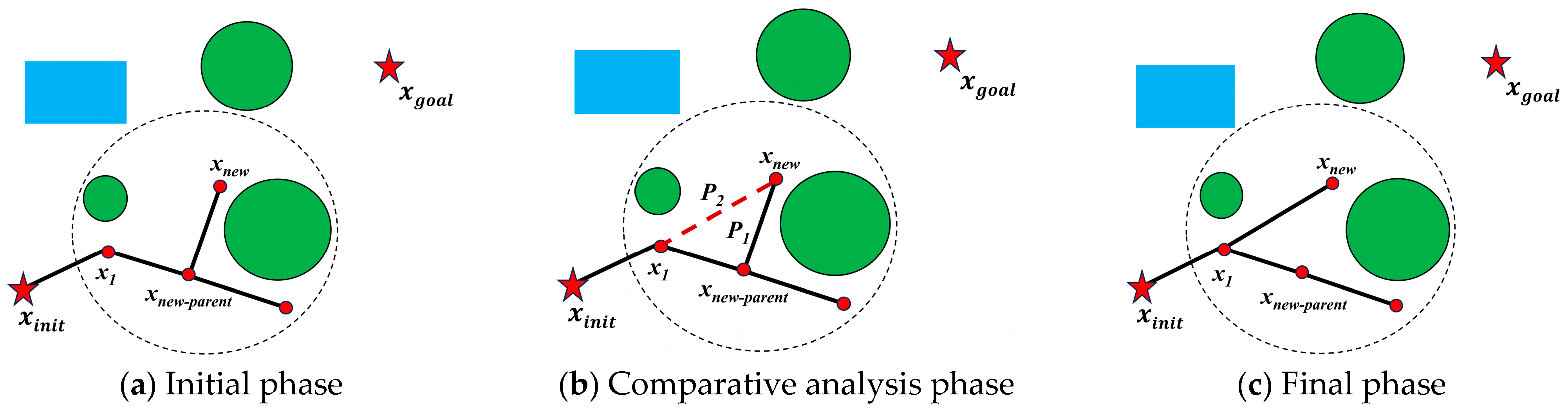 Figure 4a. The proposed strategy retains the core idea of RRT*’s random exploration, ensuring comprehensive coverage of the search space. At the same time, it addresses the inefficiency of RRT* during the expansion stage by introducing a dynamic direct-connection mechanism. Specifically, with a certain probability