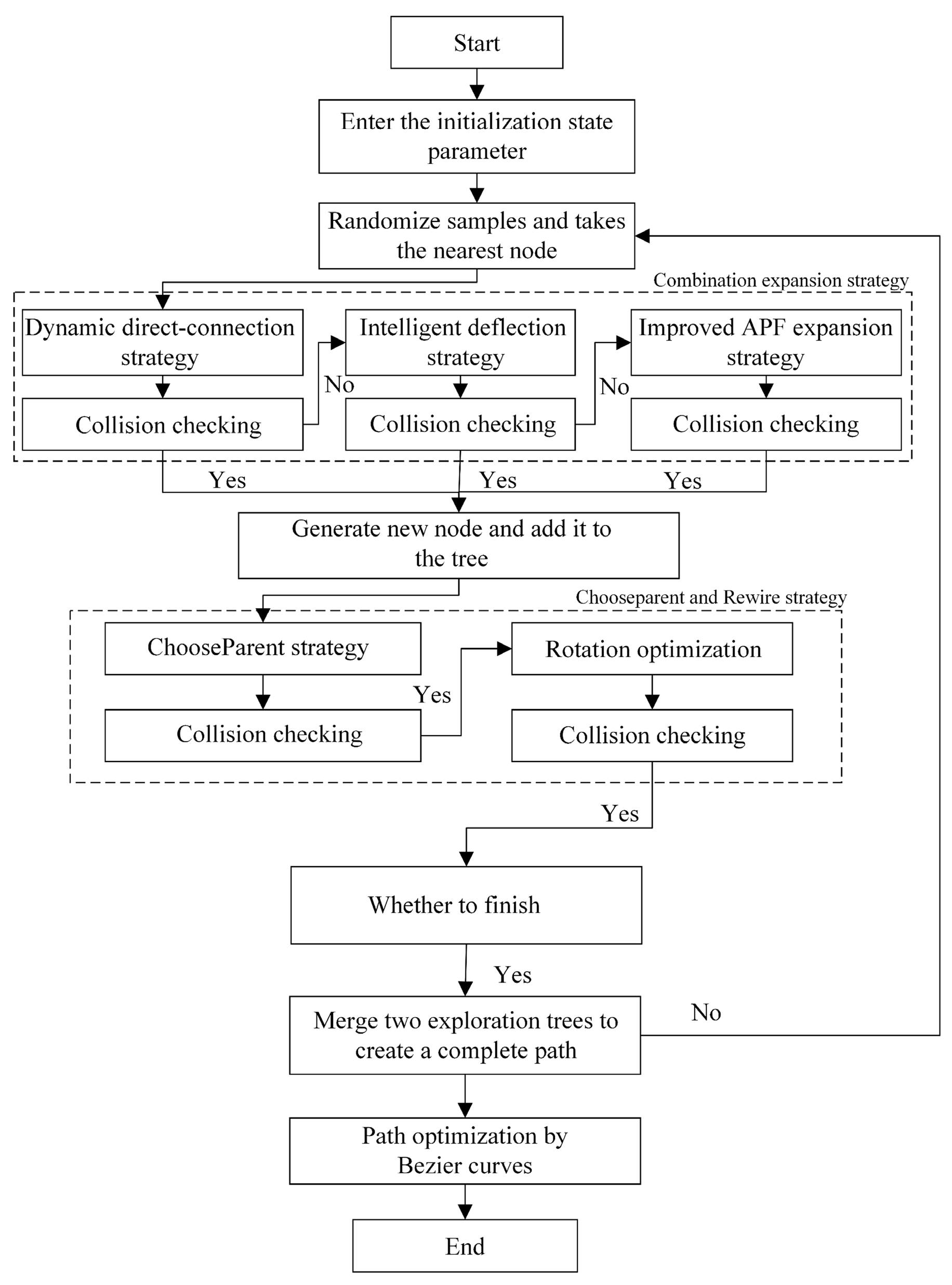 25] introduced an improved BI-RRT* algorithm, which initializes two random trees at the same time from the initial point and the goal point. Through the alternating expansion strategy, it explores feasible paths in the state space to avoid falling into local optimum in the single-direction search. Subsequently, Sun et al. [