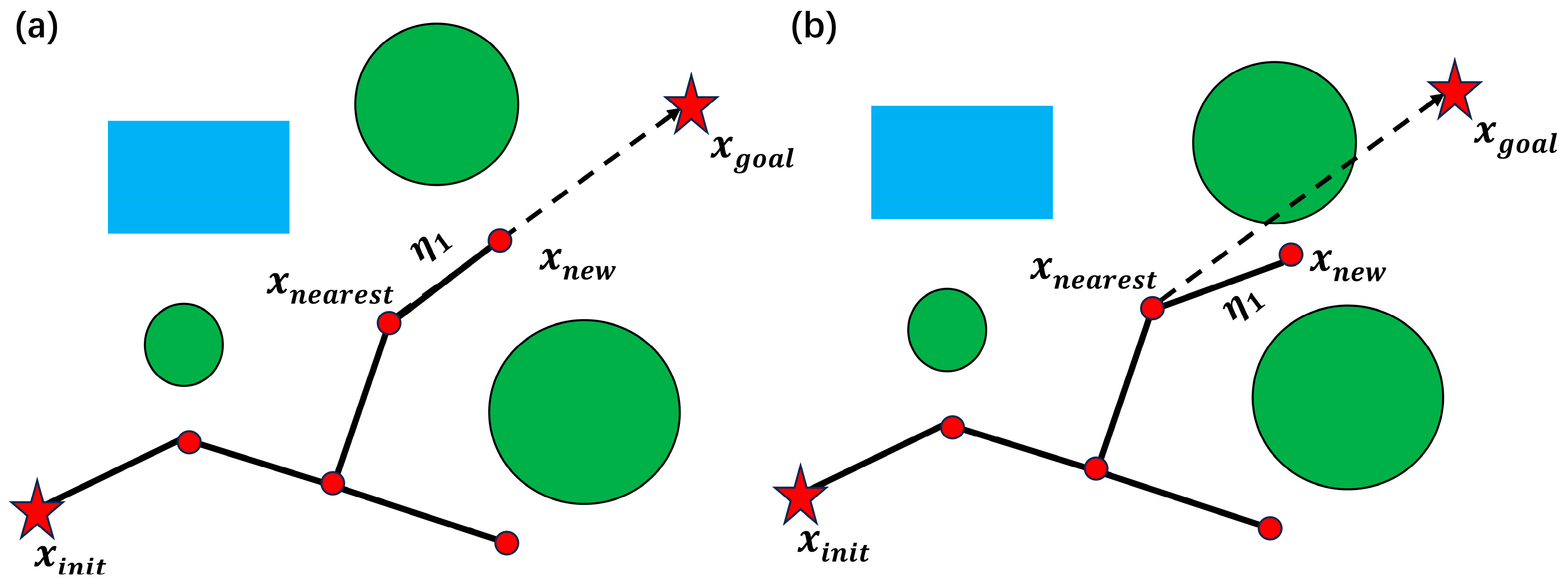 xgoal. This encourages the algorithm to prioritize direct expansions toward the target, thereby mitigating inefficiencies caused by random search.