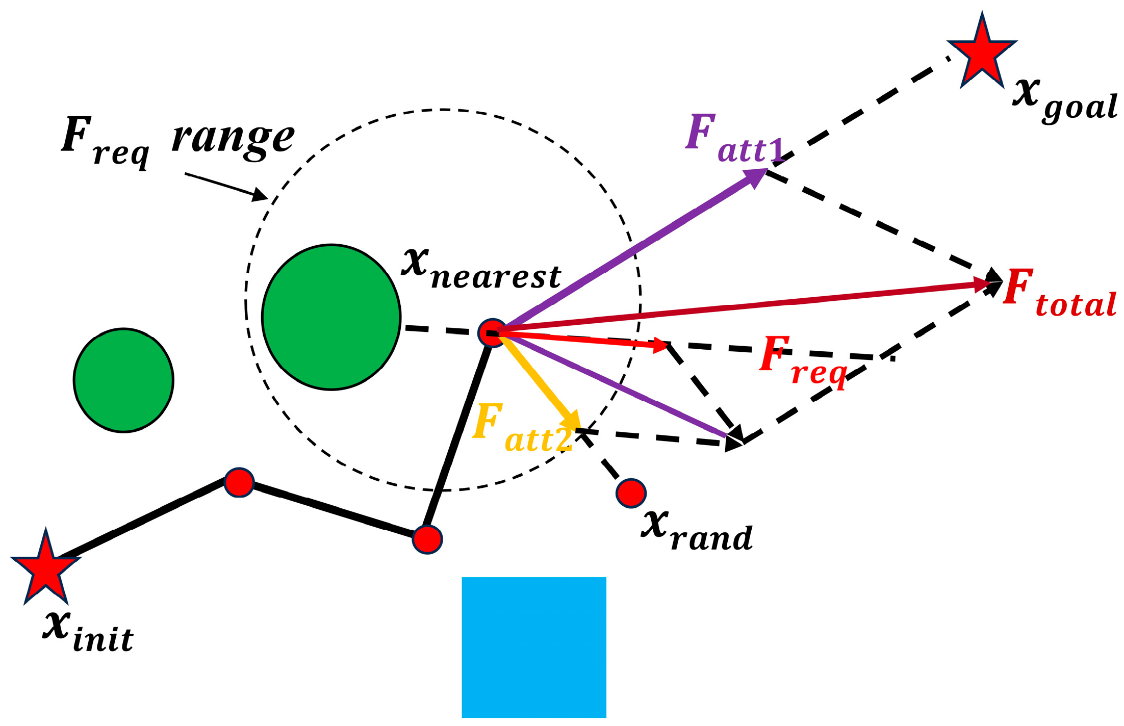31] introduced an Iterative Safe Dispatch Corridor (iSDC) framework. Their algorithm integrates bidirectional tree expansion, goal-biased elliptical sampling, and artificial potential field guidance to minimize unnecessary exploration near concave obstacles. To improve path smoothness, this paper modifies the repulsive force field function again and incorporates an additional directional force from grandparent node to parent node, which limits the path turning angle.