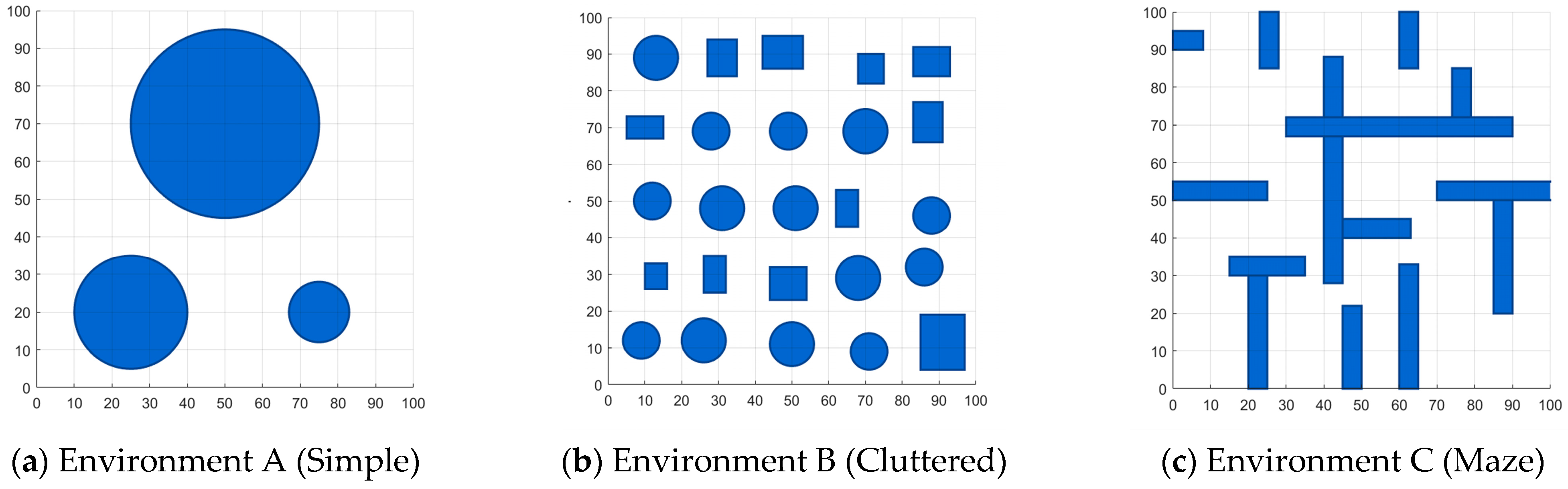 Figure 8, a continuous 100 × 100 map is selected as the two-dimensional workspace. Circular or rectangular obstacles are placed within the map, and the level of congestion is adjusted by varying their sizes. In total, two simulation environments with different congestion levels are designed. Additionally, to evaluate the algorithm’s performance in more complex scenarios, a maze-like map is introduced as the third simulation environment. These environments are named Environment A, B and C. In the simulation, we selected (0, 100) and (100, 0) as the initial node