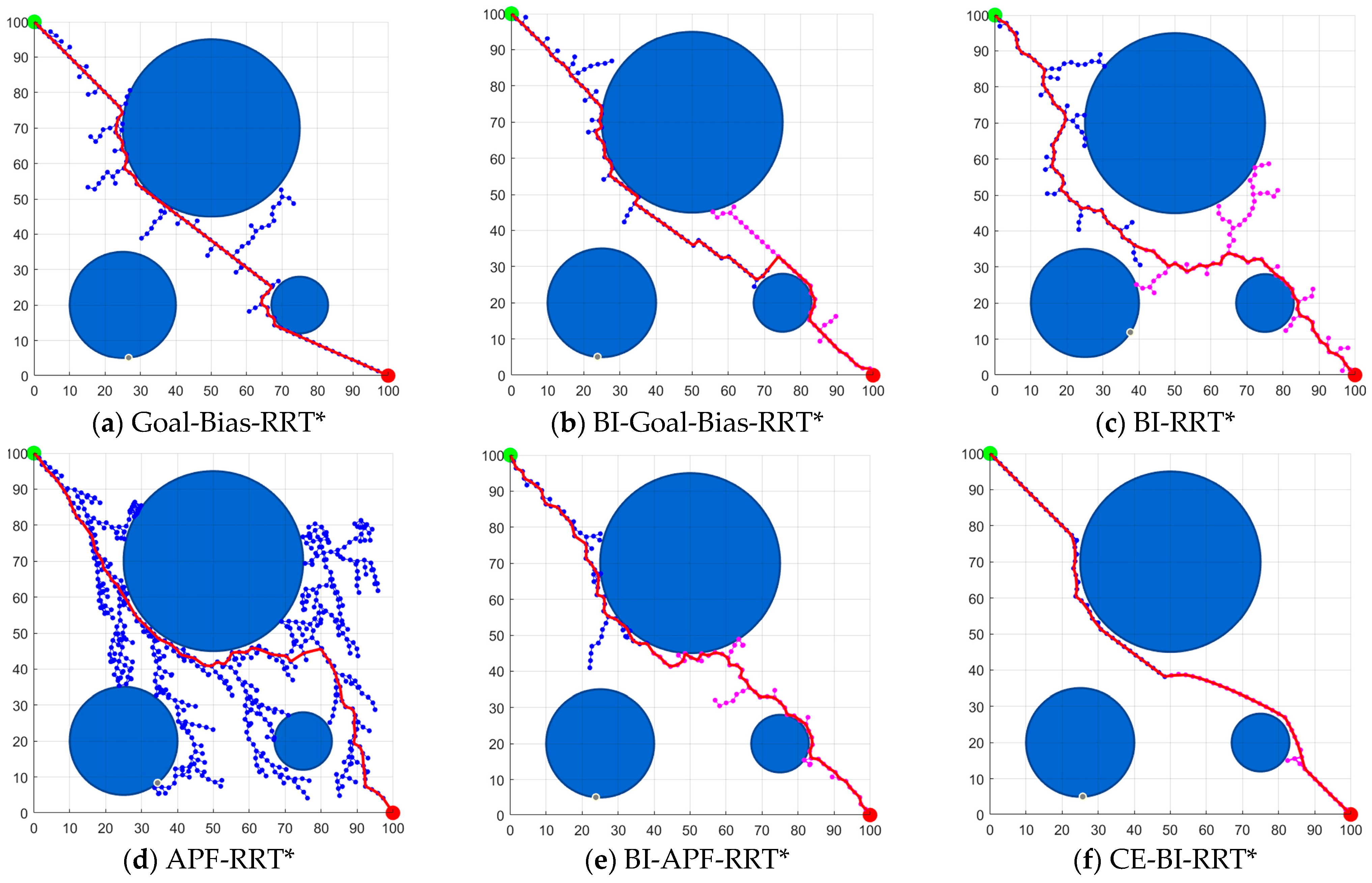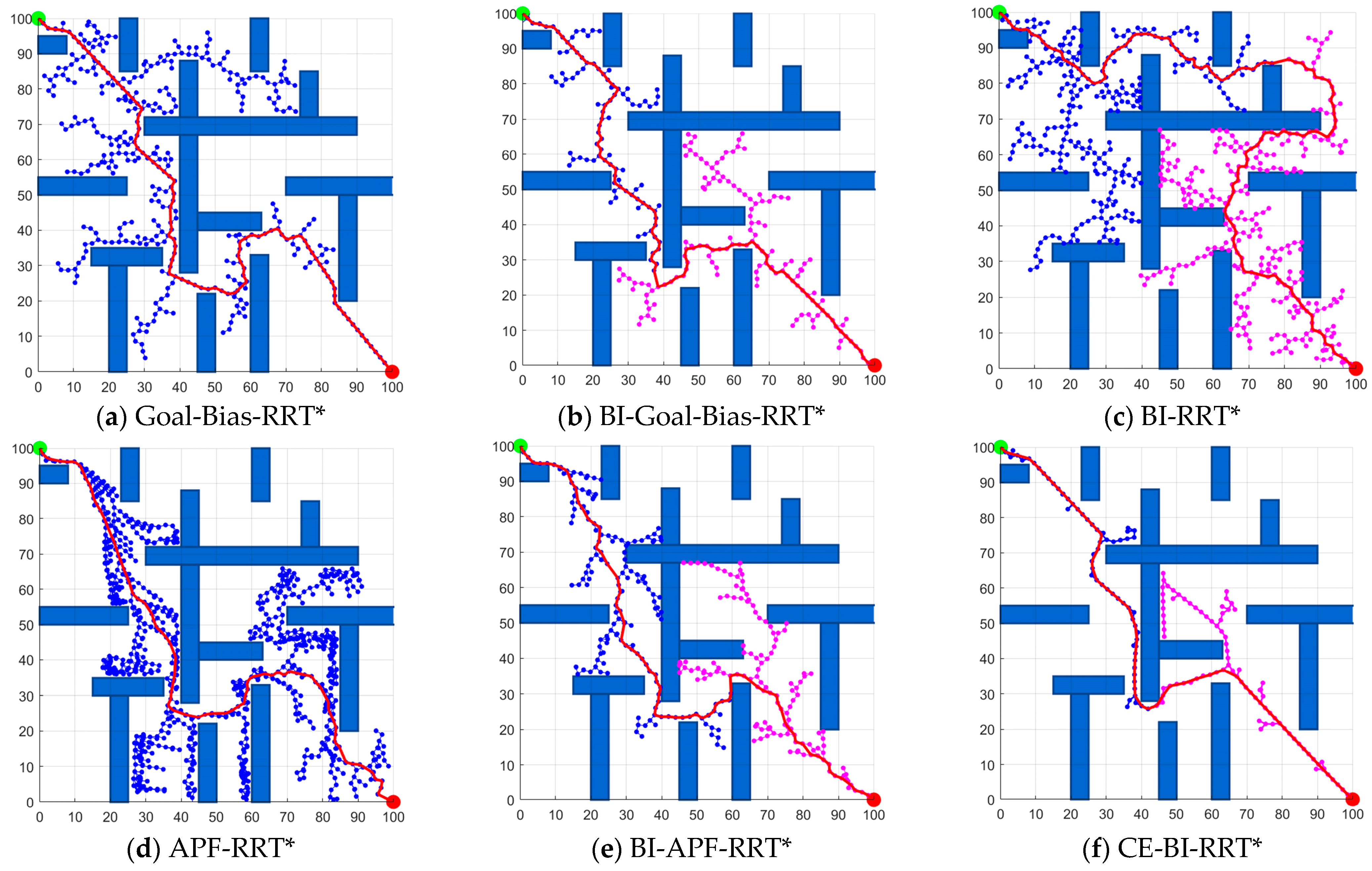 Figure 11, the CE-BI-RRT* algorithm flexibly employs different exploration strategies based on the map environment, effectively reducing the generation of redundant nodes. In spacious areas, the algorithm prioritizes rapid expansion toward the goal. When the direct connection attempt fails, the algorithm enters an intelligent deflection phase, where it performs small-angle detours based on obstacle size, enabling quick obstacle avoidance while effectively controlling the turning angles of the path. If neither of the above two expansion strategies can find a suitable direction, CE-BI-RRT* incorporates an improved artificial potential field method. By introducing a constraint force from the grandparent node to the parent node into the repulsive field function, the algorithm guides the direction of new node generation, thereby reducing path turning angles and enhancing overall path smoothness. Furthermore, the path cost function has been improved to comprehensively consider multiple factors, including path length, turning angle, and safety distance from obstacles. During the Rewire phase, a rotation optimization strategy is introduced to significantly improve both the success rate and quality of rewire. Comparative results across all evaluation metrics demonstrate that CE-BI-RRT* significantly outperforms other algorithms, highlighting its efficiency and reliability in path planning tasks within complex environments.