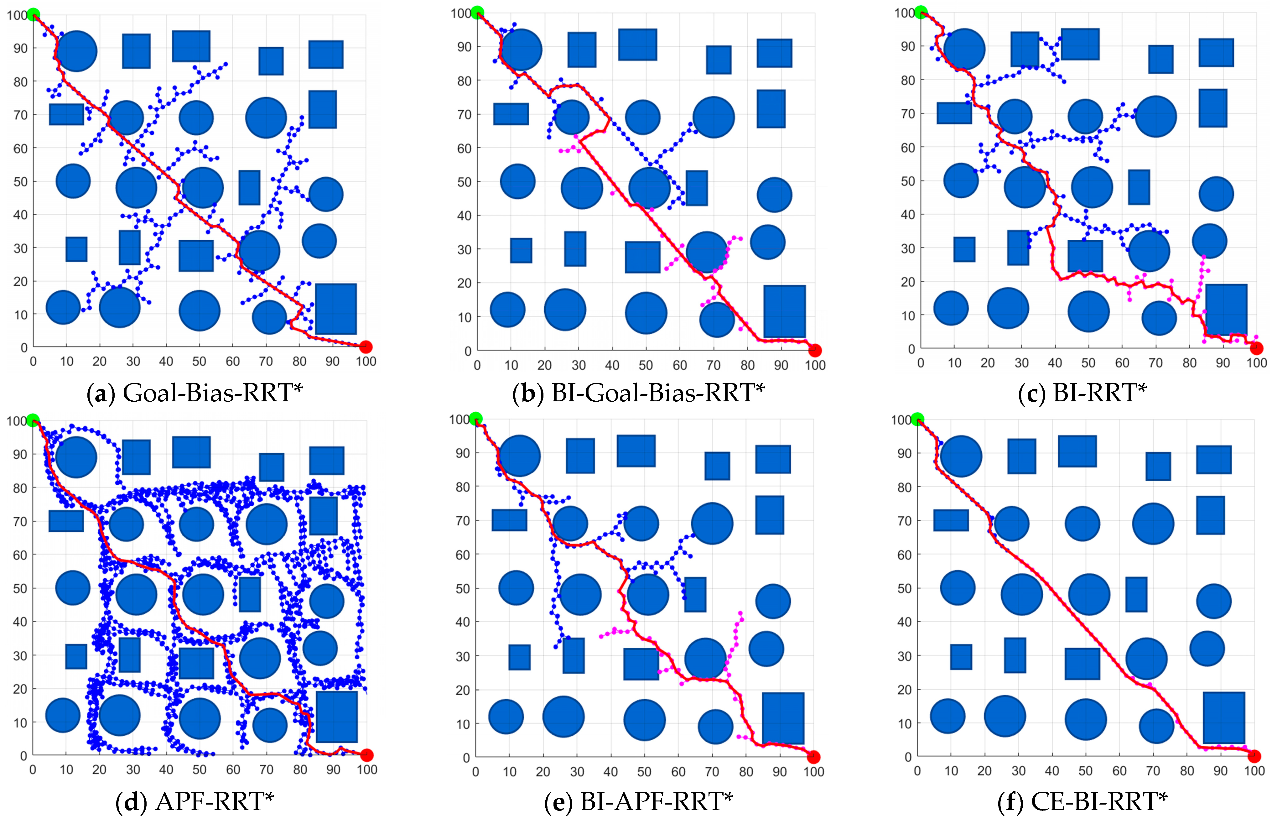 In this section, we compare the proposed CE-BI-RRT* algorithm with five benchmark algorithms: Goal-Bias-RRT*, BI-RRT*, BI-Goal-Bias-RRT*, BI-APF-RRT*, and APF-RRT*. All simulations were conducted on a computer equipped with an Intel Core i9-12700H CPU, 32 GB RAM, running Windows 11, using MATLAB R2021b.