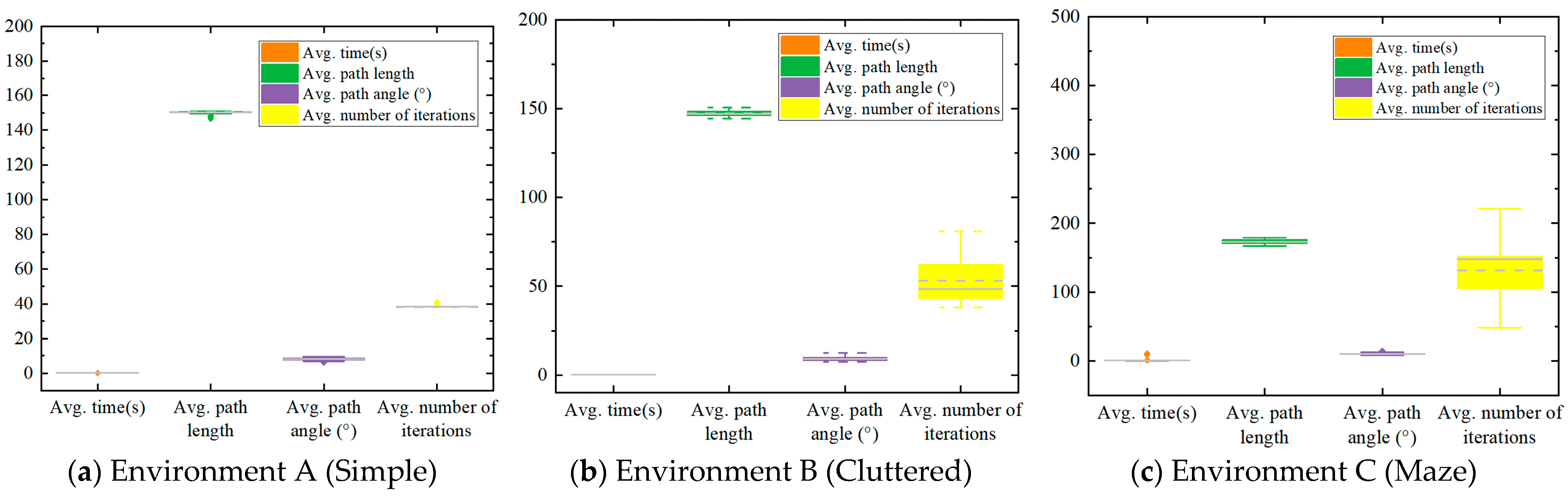 Figure 13 presents box plots of the performance metrics of CE-BI-RRT* over 50 runs in each of the three simulation environments. Observing