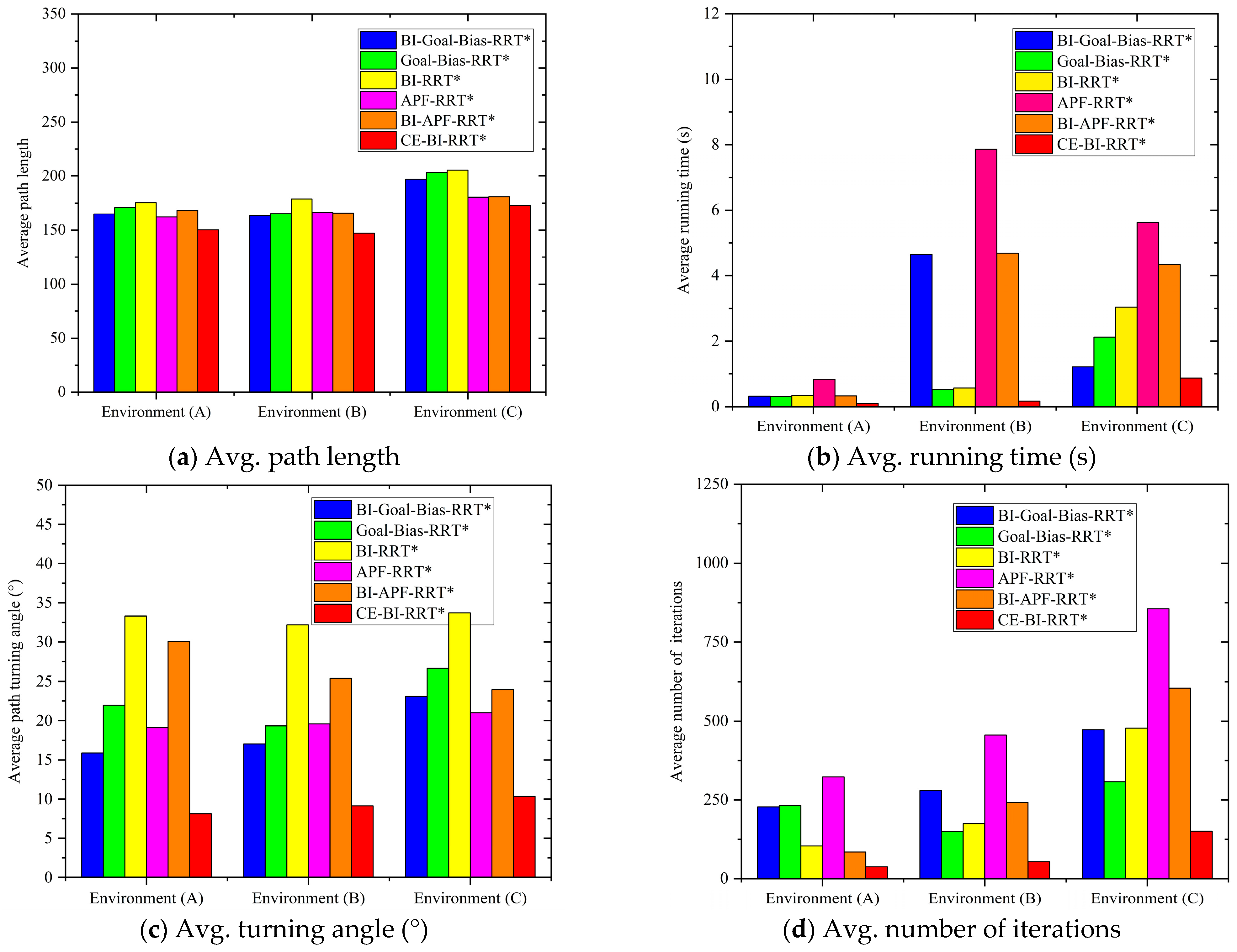 Figure 14 presents a comparison of average path length, average running time, average path turning angle and average number of iterations among all algorithms in three different environments. It can be clearly observed that the proposed algorithm significantly outperforms the other five algorithms in terms of all evaluation metrics, especially in the complex Environment C. In the maze environment, CE-BI-RRT* demonstrated improvements over five popular sampling-based path planning frameworks in multiple performance metrics. Specifically, it reduced average path lengths by 15.19%, 12.33%, 15.97%, 4.25%, and 4.48%, respectively, decreased computation time by 58.96%, 28.09%, 71.38%, 84.55%, and 79.95%, and lowered the average number of turning angles by 61.31%, 55.24%, 69.34%, 50.83%, and 56.87% across the compared algorithms.