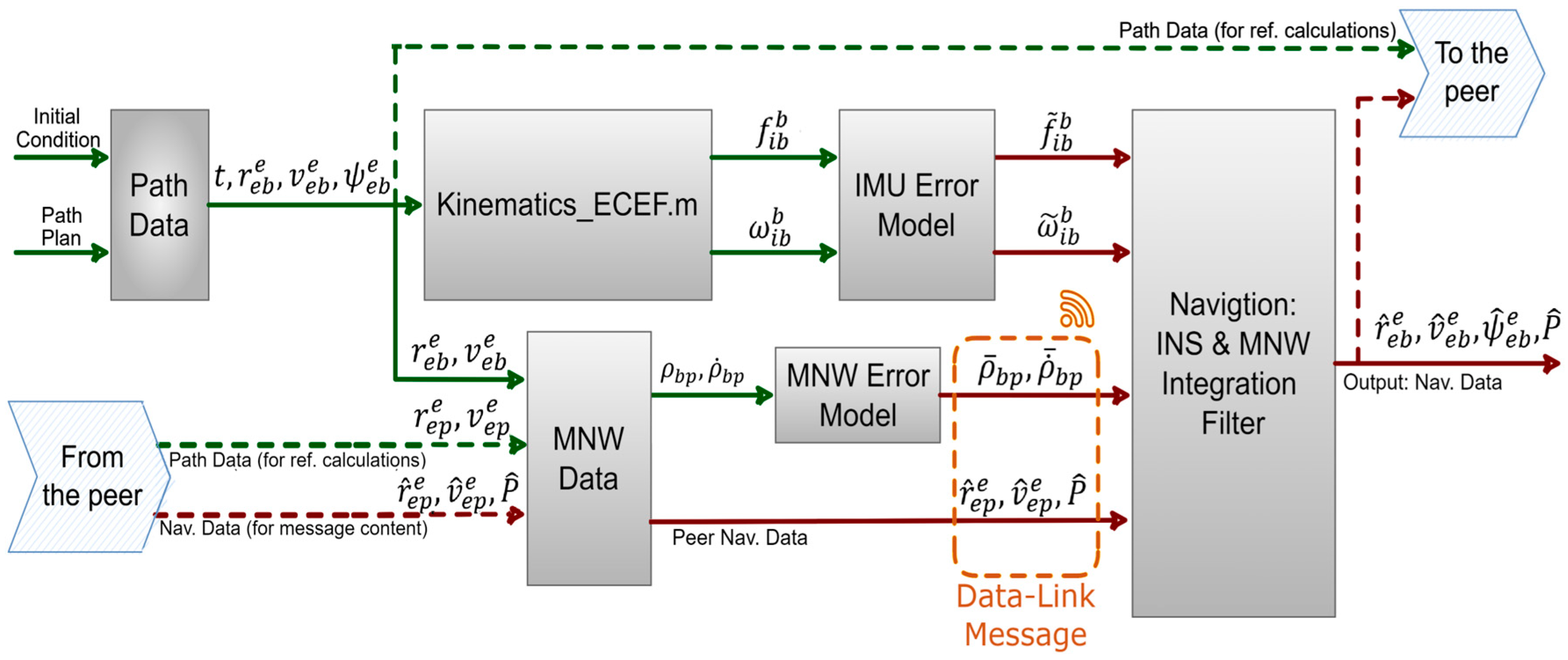 Figure 1. In the figure, green-labeled data represent ideal reference values, red-labeled data denote corrupted sensor measurements and estimation outputs, and dashed lines indicate communication between agents. Light-brown-labeled data correspond to inter-agent range and range-rate measurements transmitted via the network. Green arrows indicate error-free reference simulation values, while red arrows represent sensor-corrupted measurements or algorithm outputs. Data transmitted within communication messages are shown using dashed lines.