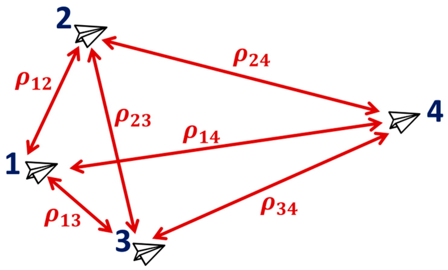 Figure 2, a four-agent network allows six possible pairwise communication combinations. At each time slot, only one agent pair is active, and the active link alternates cyclically according to the TDMA schedule. During an active communication period, both agents exchange their estimated positions and associated uncertainty data. This information is then used to enhance estimation accuracy along the line-of-sight direction between the communicating pair.