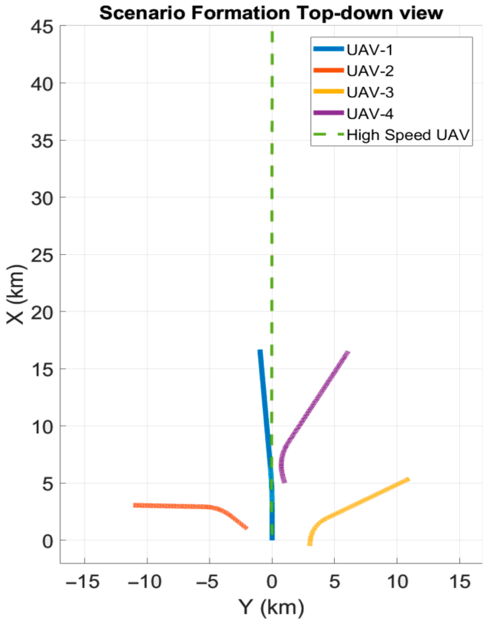 In the simulation environment, a scenario was designed to enable a fair comparison of the navigation performance of different methods. In this setup, a formation of four UAVs initially performs a coordinated flight in a predefined configuration. At the start of the simulation (), one of the UAVs in the formation releases a separate high-speed UAV, which accelerates approximately 45 km forward to execute an assigned mission.