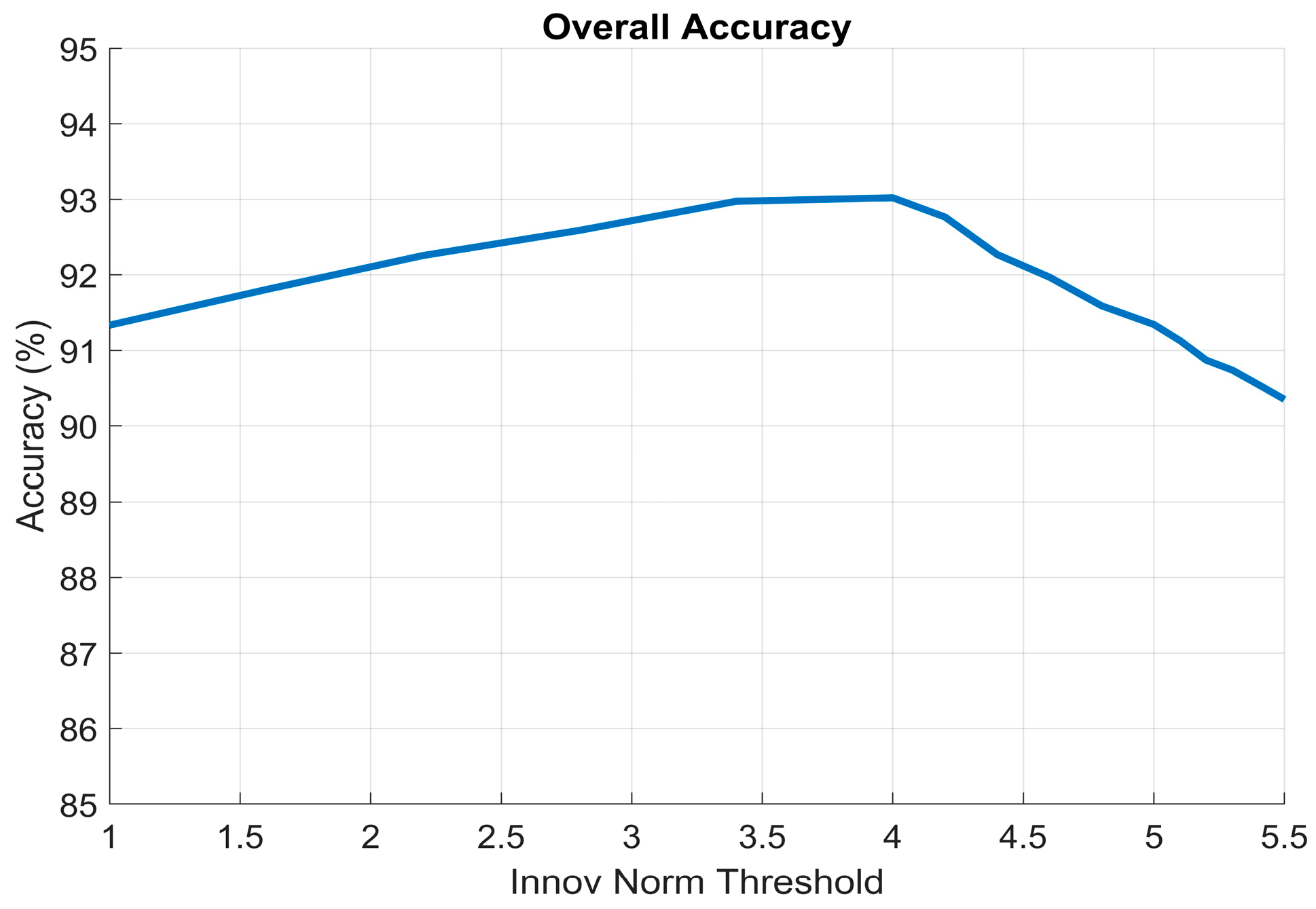 An ablation study was conducted to evaluate the sensitivity of the Innovation Filter to the choice of innovation-norm threshold. Sixteen threshold values between 1 and 5.5 were tested, and the resulting detection accuracy curve is shown in