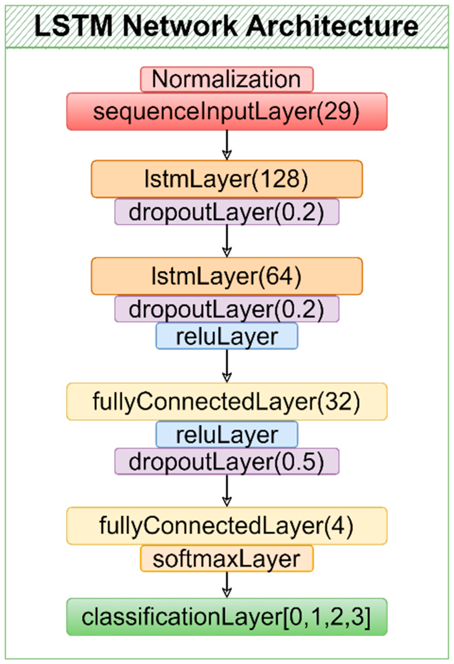 LSTM networks, known for their ability to learn temporal dependencies, provide effective solutions for capturing sequential patterns in time-series data. To account for the temporal continuity of measurement degradations, an LSTM-based architecture was developed. The objective was to enable the selection of the measurement update mode based not only on the instantaneous state but also on the temporal patterns observed in previous time steps, thereby achieving more consistent decision making. The architecture of the proposed LSTM model is illustrated in