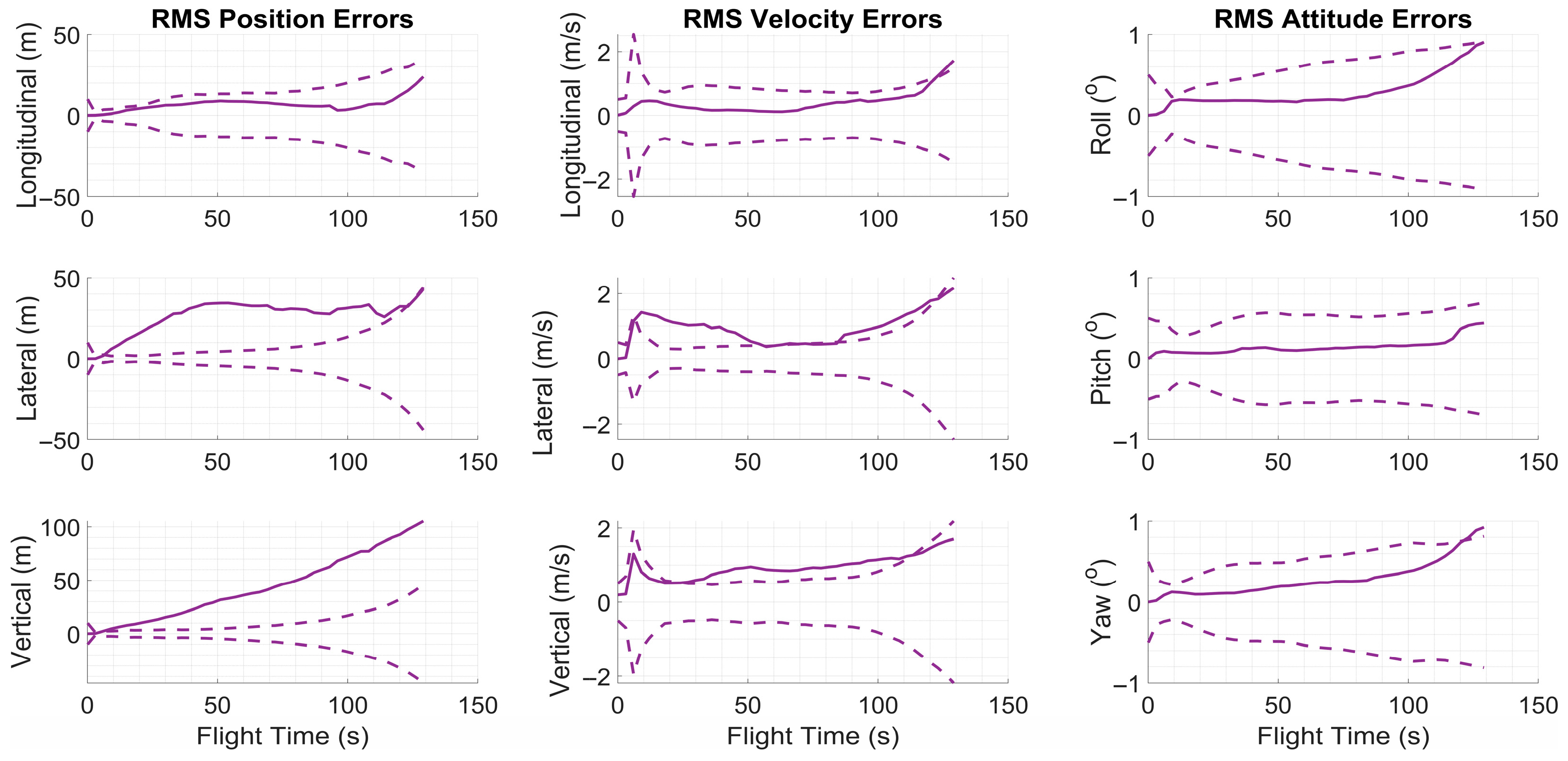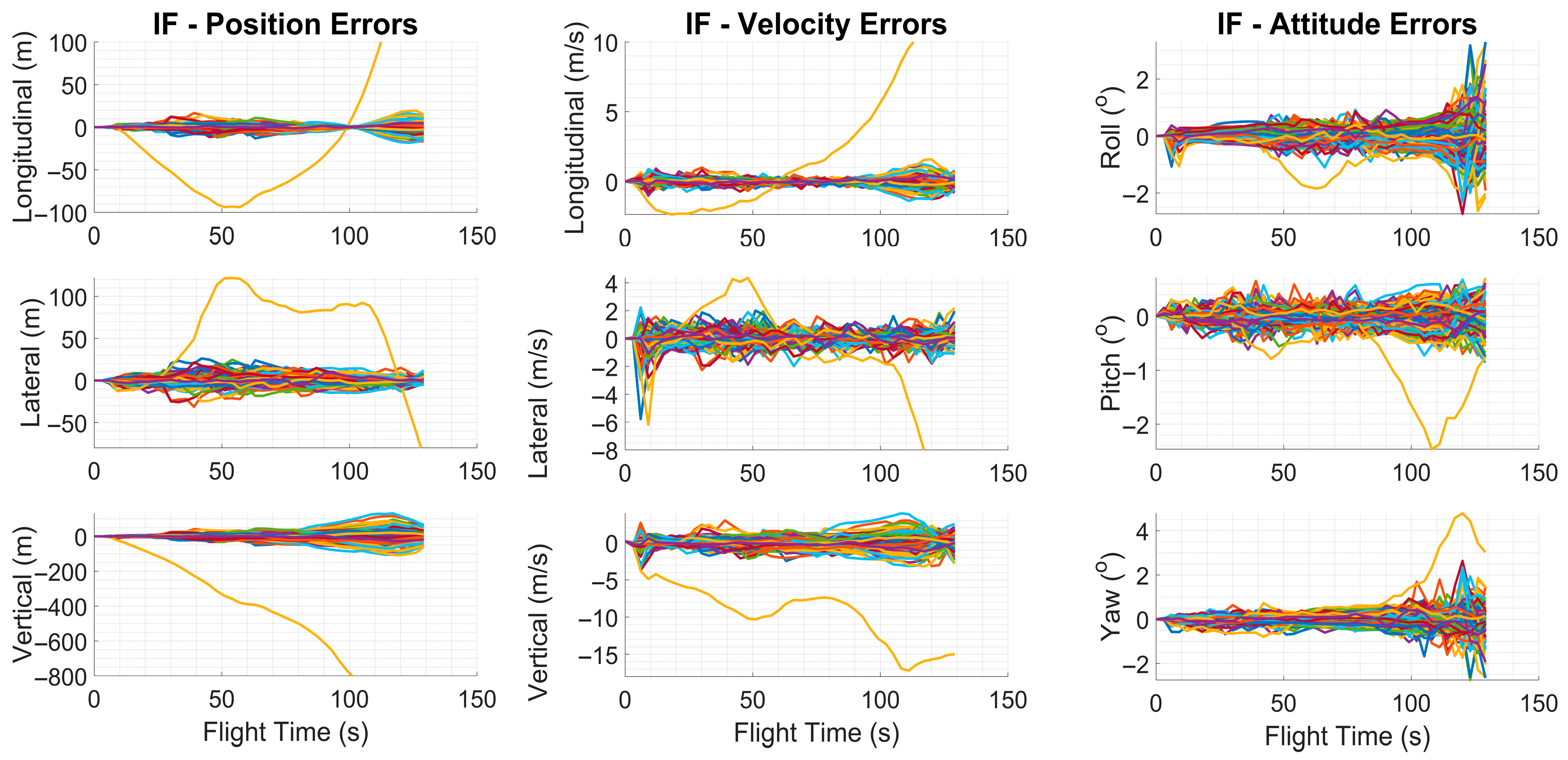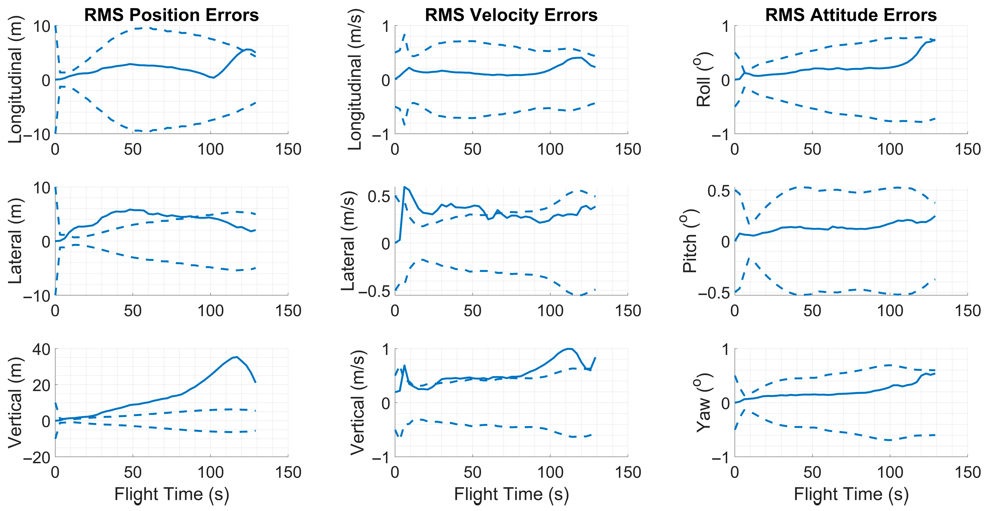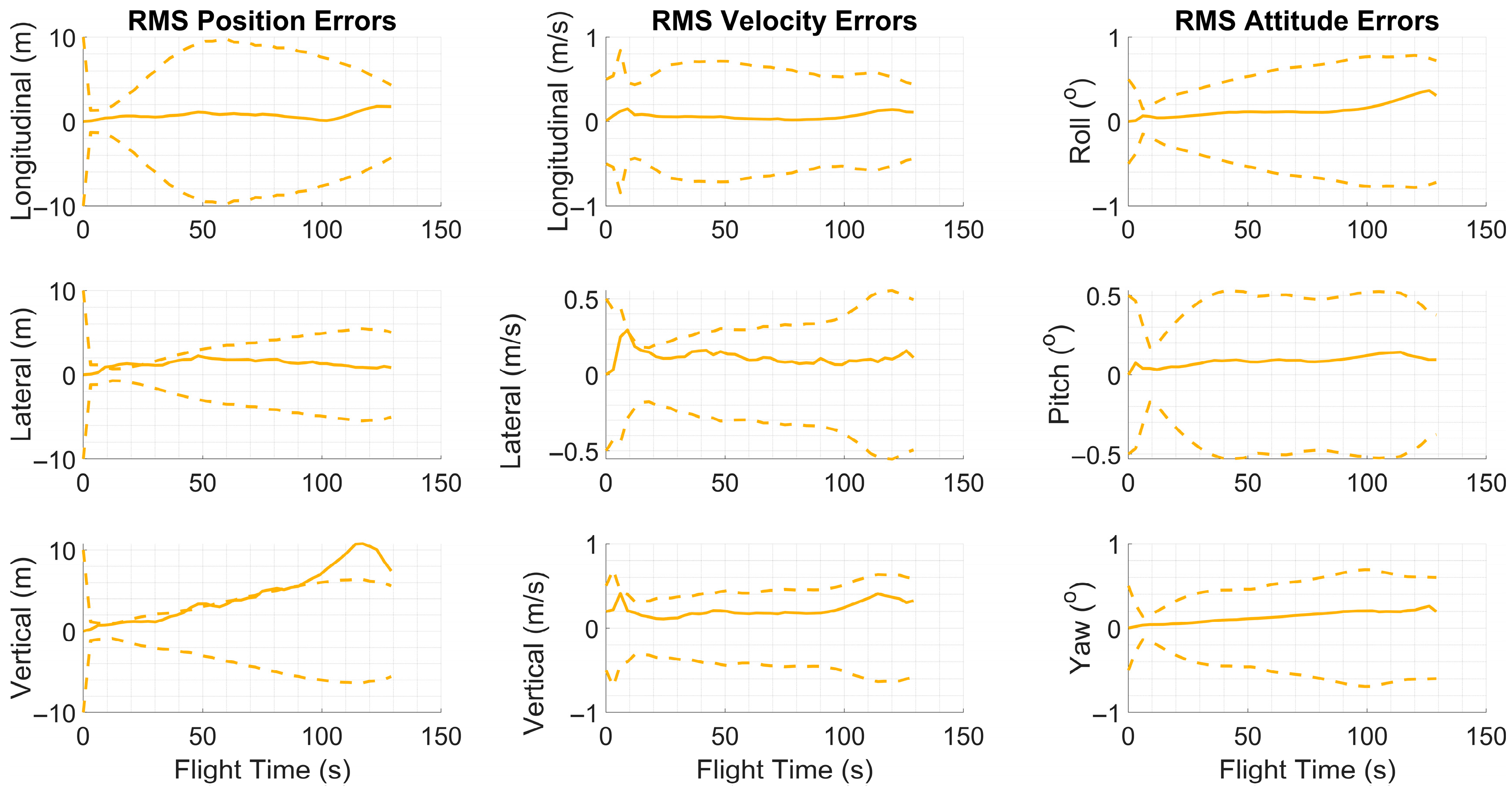 Figure 4 exhibited slight variations between runs within a predefined tolerance range. At the beginning of each run, the inertial sensor error parameters specific to that trial were randomly drawn from zero-mean normal distributions and kept constant throughout the simulation. The standard deviations of these distributions were determined based on the nominal error values provided in