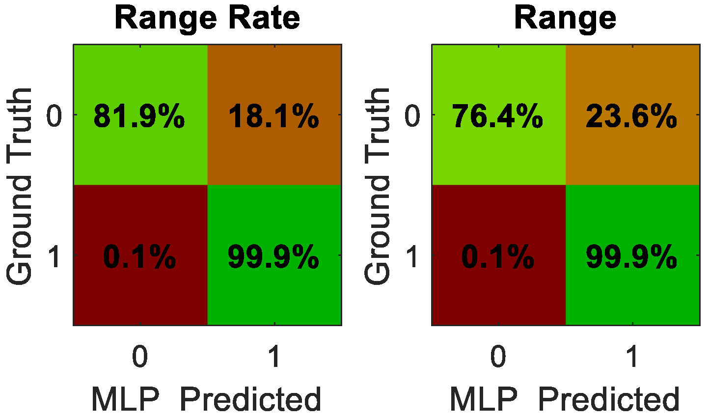 The 29-dimensional feature vector was selected after a series of ablation experiments conducted during network development. Early prototypes that used only raw range and range-rate measurements achieved poor discrimination performance, especially under intermittent link errors and Doppler-induced disturbances. Features related to innovation statistics, covariance-weighted residuals, and Doppler consistency proved essential—removing either group caused the MLP validation accuracy to drop by 10–15%. Additional tests confirmed that reducing the feature set below 20 elements consistently degraded classification accuracy, particularly in scenarios with asynchronous message arrivals or rapidly varying relative geometries. Because the decision mechanism is instantaneous rather than temporal, the network requires a sufficiently rich snapshot of the current measurement and its reliability indicators. The resulting 29-feature configuration provided the most reliable balance between representational richness and computational efficiency.