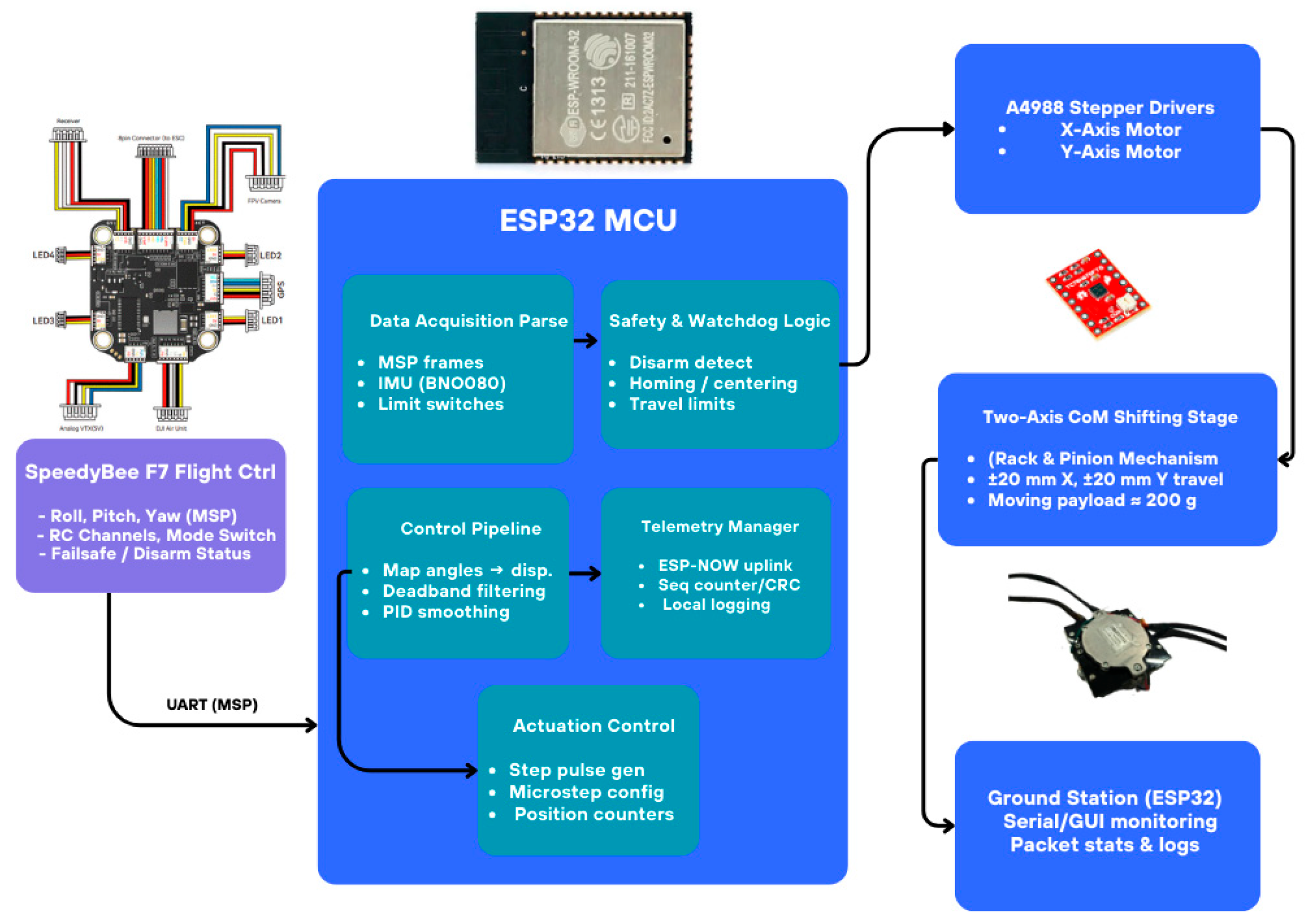 - Integrating a dynamic CoM shifting mechanism is a critical design strategy for next-generation UAVs, providing stability even under motor-out or free-fall condi-tions, and substantially improving safety, efficiency, and mission survivability.
