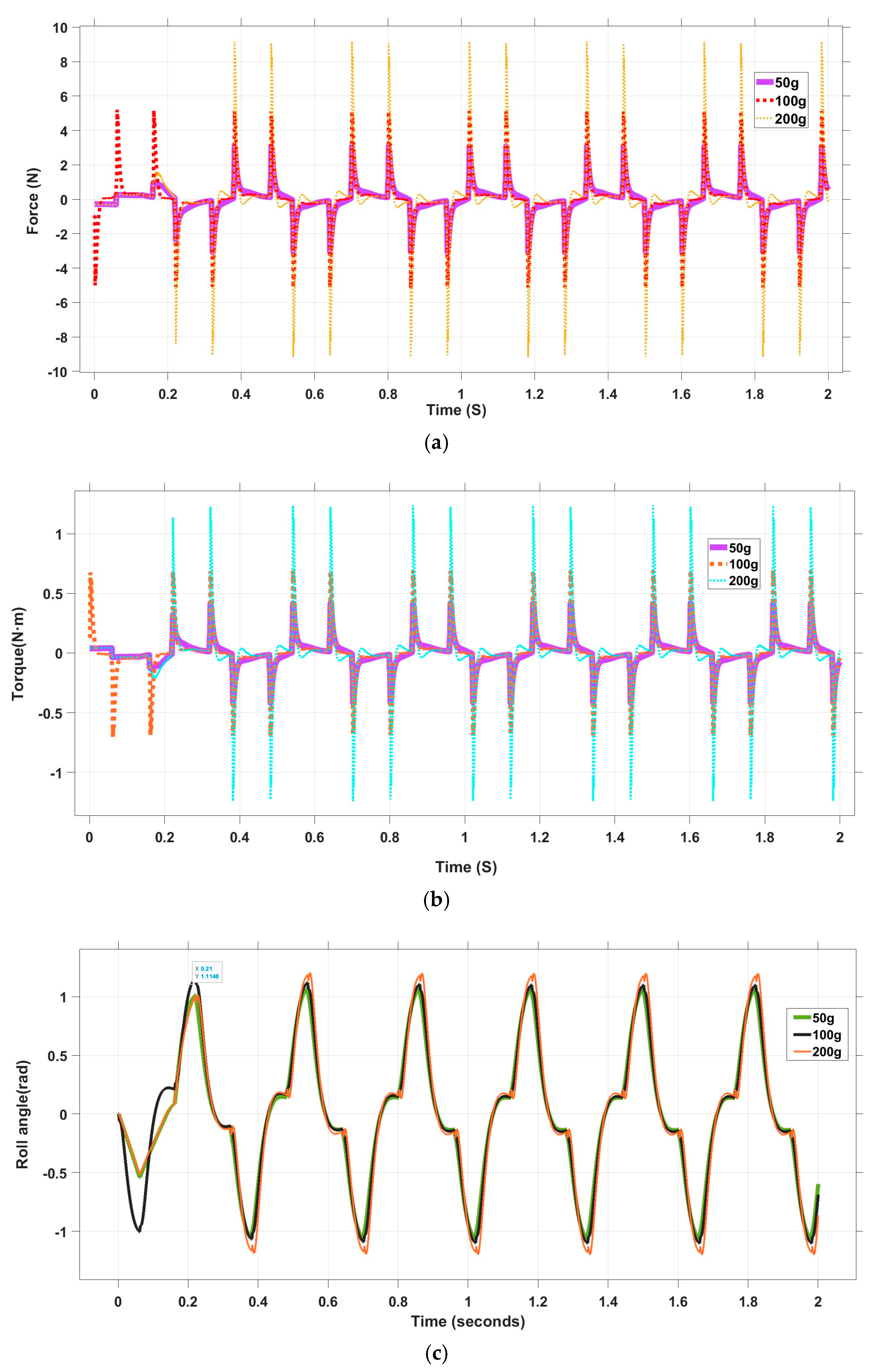 | Payload Mass (g) | Maximum Force (N) | Maximum Torque (N·m) | Maximum Roll Angle (rad) |