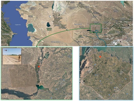 Anthropogenic factors, causing a sharp increase in the intensity of soil and water resource use, as well as climate change, lead to increased salinity and subsequent land degradation, especially in arid regions of Earth [1]. Currently, more than 20% of irrigated land is salinized to different degrees [2], and over the past 30 years, the area of such land has increased by 2.4 times [3]. There are numerous examples of negative changes that have led to an increase in the area of salinized land [4] and production problems, especially in arid regions. Such phenomena are characteristic of Central Asia as a whole [5], where there are large areas of land and limited water resources. The lands of southern Kazakhstan are an example of such negative changes. For example, in the Kyzylorda region, almost 85% (20.3 million hectares) of the total land area (22.6 million hectares) is salinized [6], and in the Turkestan region, 32% of cultivated fields are salinized [7]. In total, saline soils cover more than 40 million hectares in Kazakhstan [8]. In this regard, a number of strategic documents of the Government of Kazakhstan set out plans for the development of crop production [9] and modernization of agriculture [10], including through the use of digital technologies [11]. Overcoming negative factors and increasing crop production volumes is achieved through the development of precision farming technologies [12]. Precision farming involves managing agricultural production in both spatial and temporal terms, where cultivated fields and their plots are considered individually; moreover, only the necessary resources are used [13]. This approach allows minimization of the amount of agrotechnical operations and costs associated with chemical and biological (pesticides, herbicides, etc.) impacts on fields, while ensuring optimal conditions for the growth and development of crops. To implement these technologies, it is necessary to obtain accurate and timely information about the condition of fields and crops. The most common way to obtain this type of information is employment of satellite products based on Sentinel-1,2, Terra, Landsat, Kompsat, Modis, Aster, and other satellite images [14].