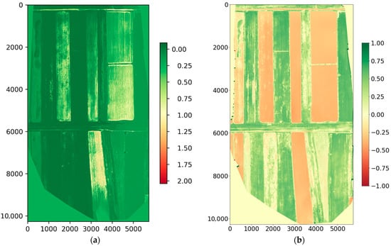 - The fields were flown over, and multispectral images were obtained. The multispectral images were processed to obtain spectrum maps, spectral indices, and a DSM map.