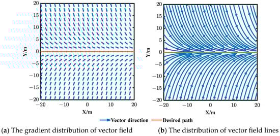 The main idea of the guiding vector field is the creation of a vector space encompassing the desired trajectory, where each point within this space is assigned a specific vector direction. These vector field lines are designed to converge toward the desired trajectory [41,42], and the trajectory tracking could be realized by sailing along the corresponding heading. The guiding vector field offers the advantage of simplifying the control law design while ensuring high tracking accuracy. The designed guiding vector field is shown as follows.