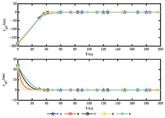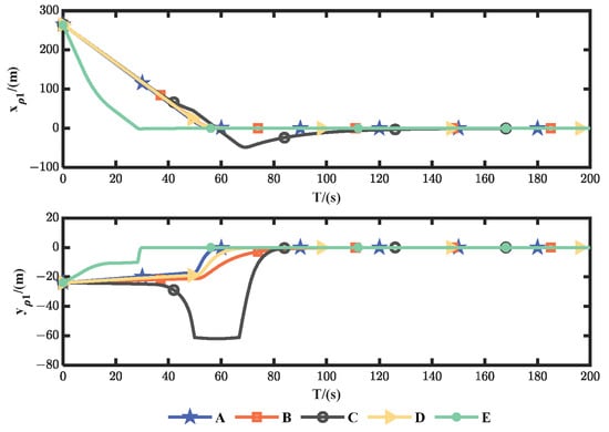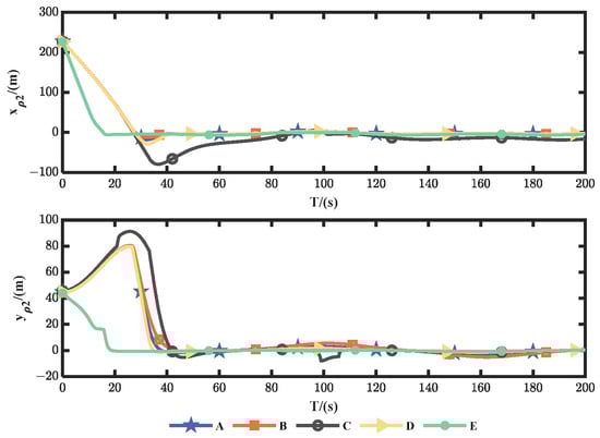 Examination of Figure 10, Figure 11 and Figure 12 and Figure 15, Figure 16 and Figure 17 reveals that the initial position of the USV exerts a notable influence on its trajectory tracking error. The initial positions of USV1 and USV2 are located in front of and behind the motion direction of USV0, respectively. As shown in Figure 10, Figure 15 and Table 2, USV1, using methods “C” and “E”, showing a wide range of steering and requiring a long distance to achieve trajectory tracking. USV2, employing methods “B” and “D”, utilizes a trajectory tracking approach that considers both and to achieve convergence in sequence. The realization of the trajectory also requires a long distance. However, method “A” could adopt an appropriate tracking strategy, based on the varying initial positions of the USVs, to achieve trajectory tracking that conforms to the desired formation. Method “A” also shows better tracking performance.