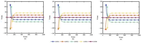 The formation of USVs tracking straight trajectory. (a): method “I”; (b): method “II”; (c): method “III”.