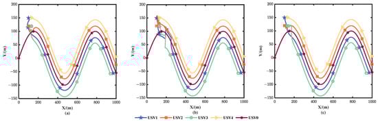 The formation of USVs tracking curve trajectory. (a): method “I”; (b): method “II”; (c): method “III”.