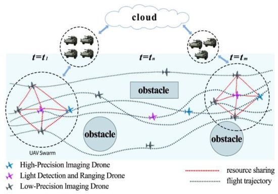 UAV swarm formation is a collaboration-based multi-agent system that can be composed of both UAVs under ideal conditions and UAVs under complex conditions, and its core objective is to efficiently accomplish flight missions through collaborative decision-making [26,27]. By using various types of UAV swarms in formation for collaborative decision-making, it not only helps to reduce functional redundancy in UAV swarms under ideal conditions, but also enables more flexible and autonomous decision-making by taking advantage of the differentiated behavior patterns of UAVs. By giving full play to the respective advantages of different types of UAVs, combined with precise environmental sensing and efficient information-sharing mechanisms, it is able to achieve the comprehensive goal of multiplying its effectiveness and significantly improving the response capability of UAV swarms in complex environments. In order to more fully utilize swarm advantages, improve system robustness and enhance complementary capabilities between different platforms, it is necessary to enable collaborative decision-making in UAV swarms. The end-edge-cloud architecture is composed of three main components: the UAV swarm in complex environments, the edge server, and the cloud server. UAV swarms under complex conditions consist of UAVs equipped with sensors of different accuracies and enable short-term model tuning through edge servers deployed on command vehicles, while cloud servers are responsible for long-term model optimization [28,29,30]. Depending on the geographical location of the device and the division of roles, these three parts take on different functions and work together to realize intelligent decision-making for UAV swarms. Figure 1 depicts the formation control problem of UAV swarm