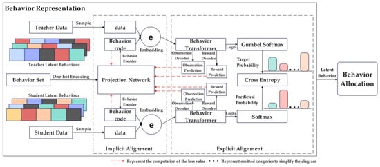 During the display alignment process, teacher behavior representation and student behavior representation are mapped to a set of learnable behavior prototypes , where each behavior prototype represents a different skill category. By the minimization of cross-entropy loss , it minimizes the difference between the predicted probability distribution and the target probability distribution and achieves an effective alignment of student and teacher behavior representations [35].